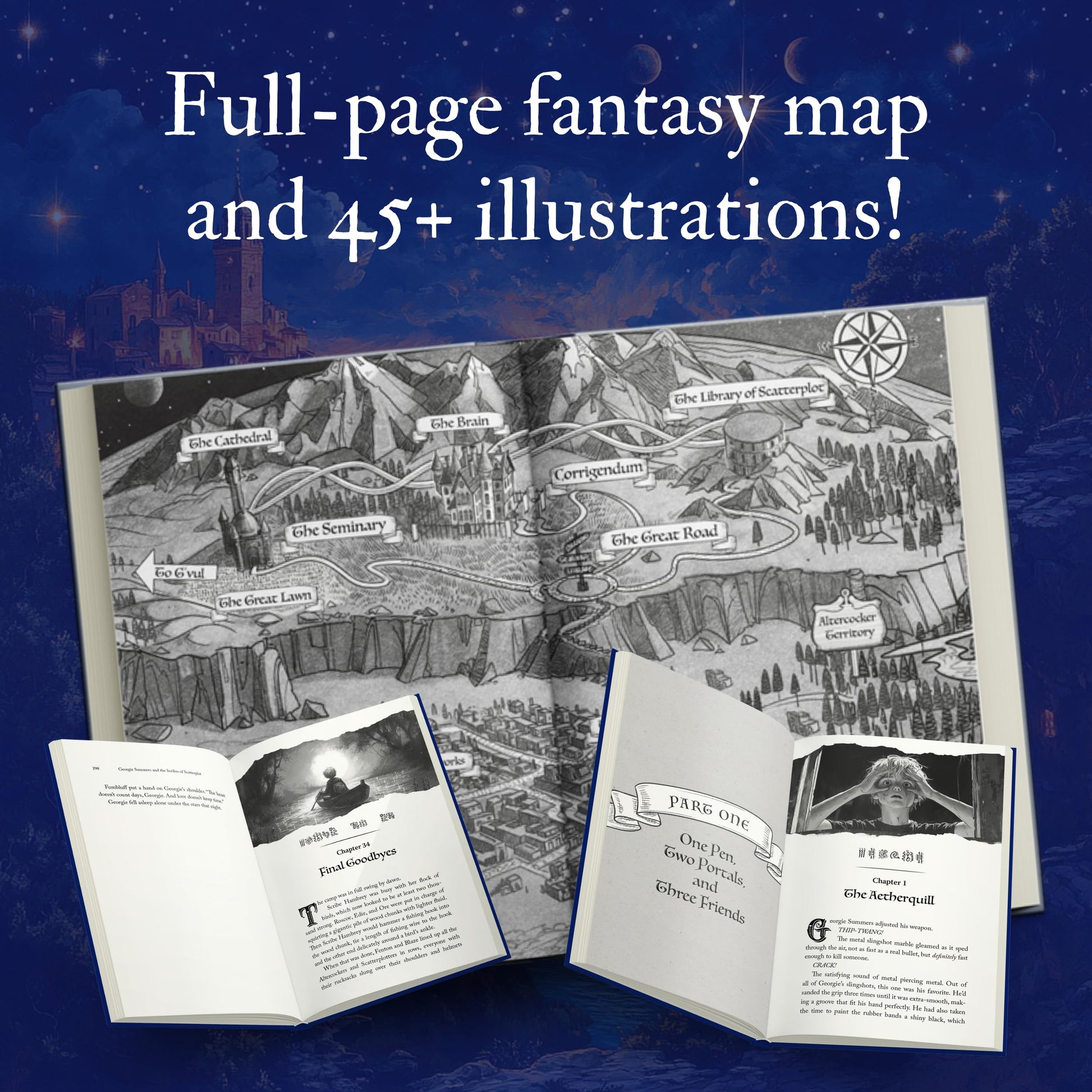That is, until a terrifying man—a man dressed in shiny black boots and bugs crawling out of a hole in his neck—climbs through a portal in midair and kidnaps Georgie’s father. Where did this man come from? Why was he looking for an ancient fountain pen? What secrets has Georgie’s father been keeping from him?
