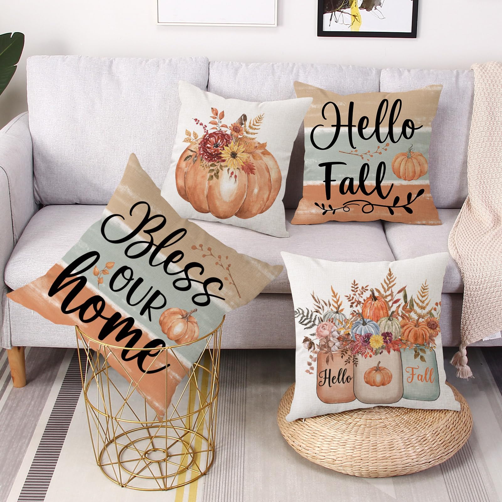 Gujiahone Fall Decorative Pillow Covers 18 x 18 Inch Set of 4 Bless Our Home Hello Fall Pumpkin Flowers Mason Jar Autumn Thanksgiving Farmhouse Decoration for Sofa Couch Living Room