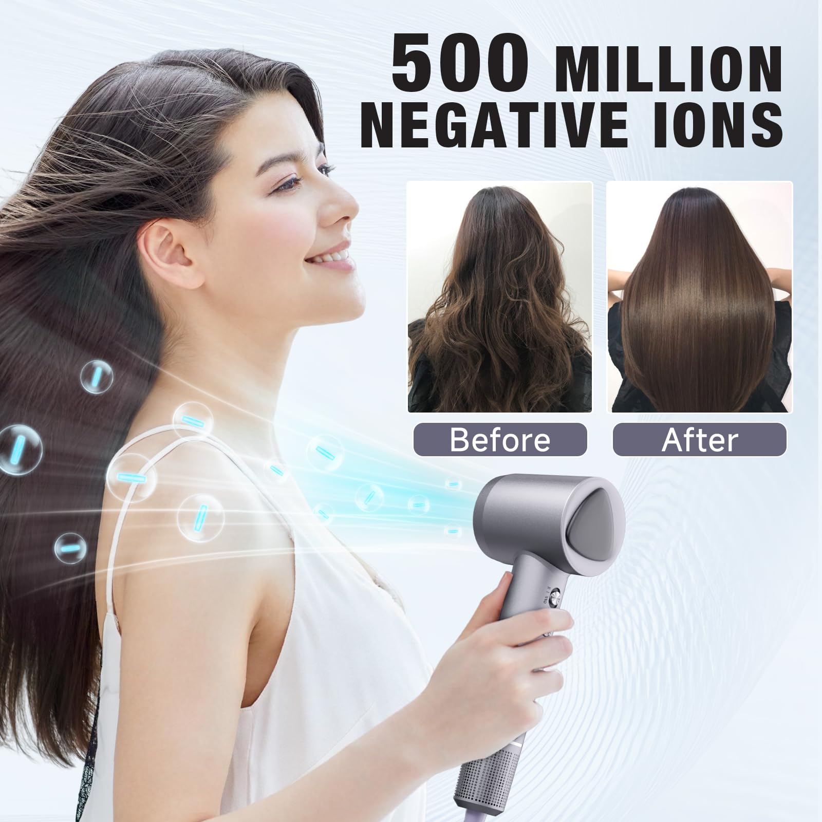 - 【Advanced Ionic Technology】Our blow dryer uses advanced ionic technology to release up to 500 million negative ions, neutralizing positive charges in hair to reduce frizz and static for smoother, shinier hair. The ions infuse moisture deep into the hair shaft, preventing dryness, split ends, and heat damage. Ideal for damaged or color-treated hair, it restores health, leaving hair soft, shiny, and elastic. Whether fine or thick, it ensures salon-like smoothness and enhances styling results.