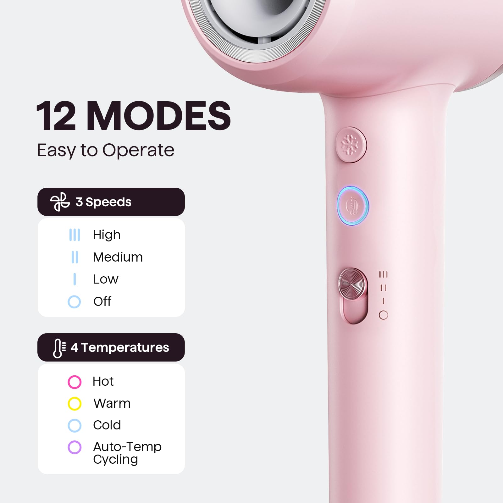 - Heat Damage Protection: This hair dryer uses powerful, high-speed airflow instead of extreme heat to dry hair quickly while helping reduce heat damage. Its advanced brushless motor maintains hair’s natural shine and smoothness. With 12 settings (4 heat levels: cold/warm/hot/auto-cycling and 3 speeds), it offers precise control for all hair types and styling needs