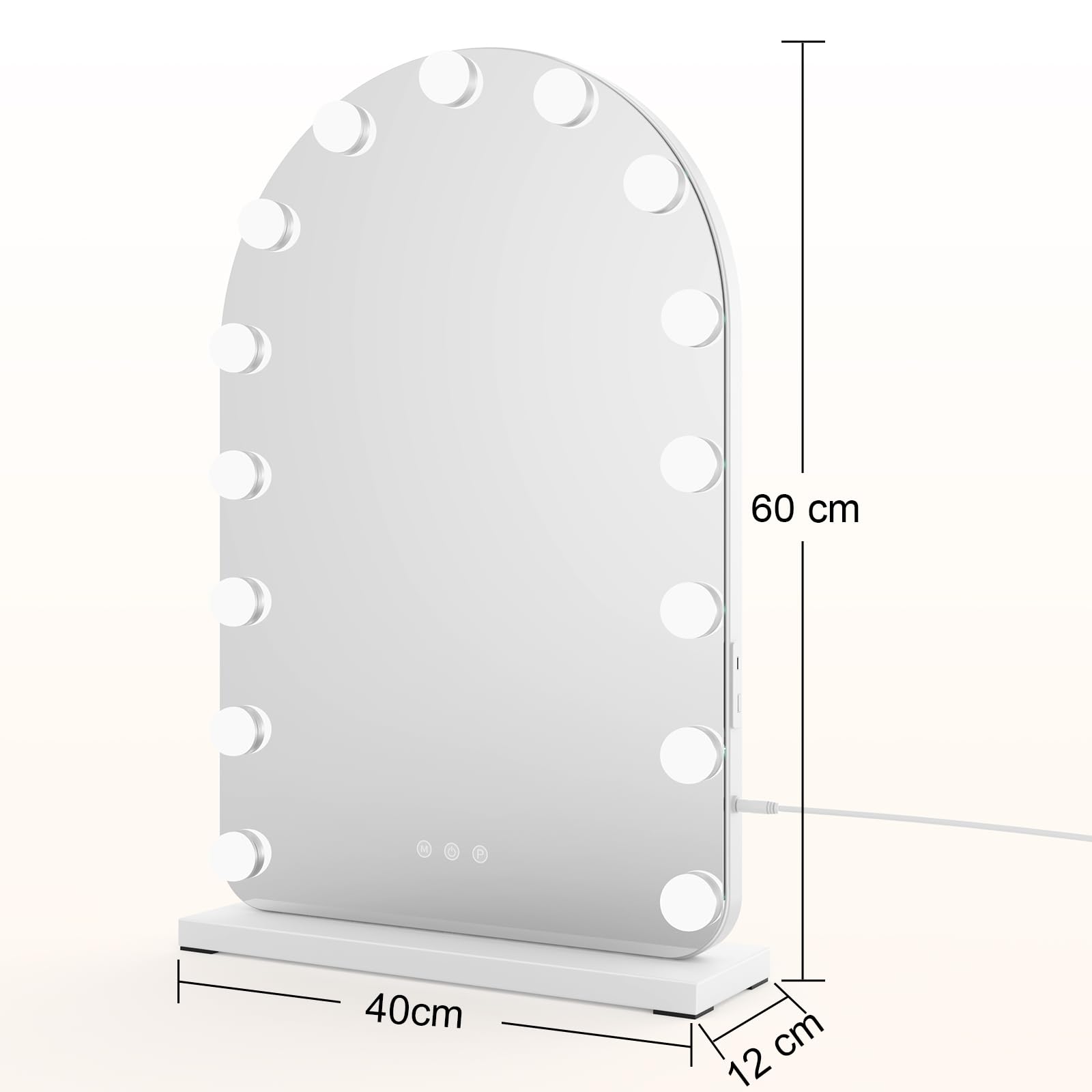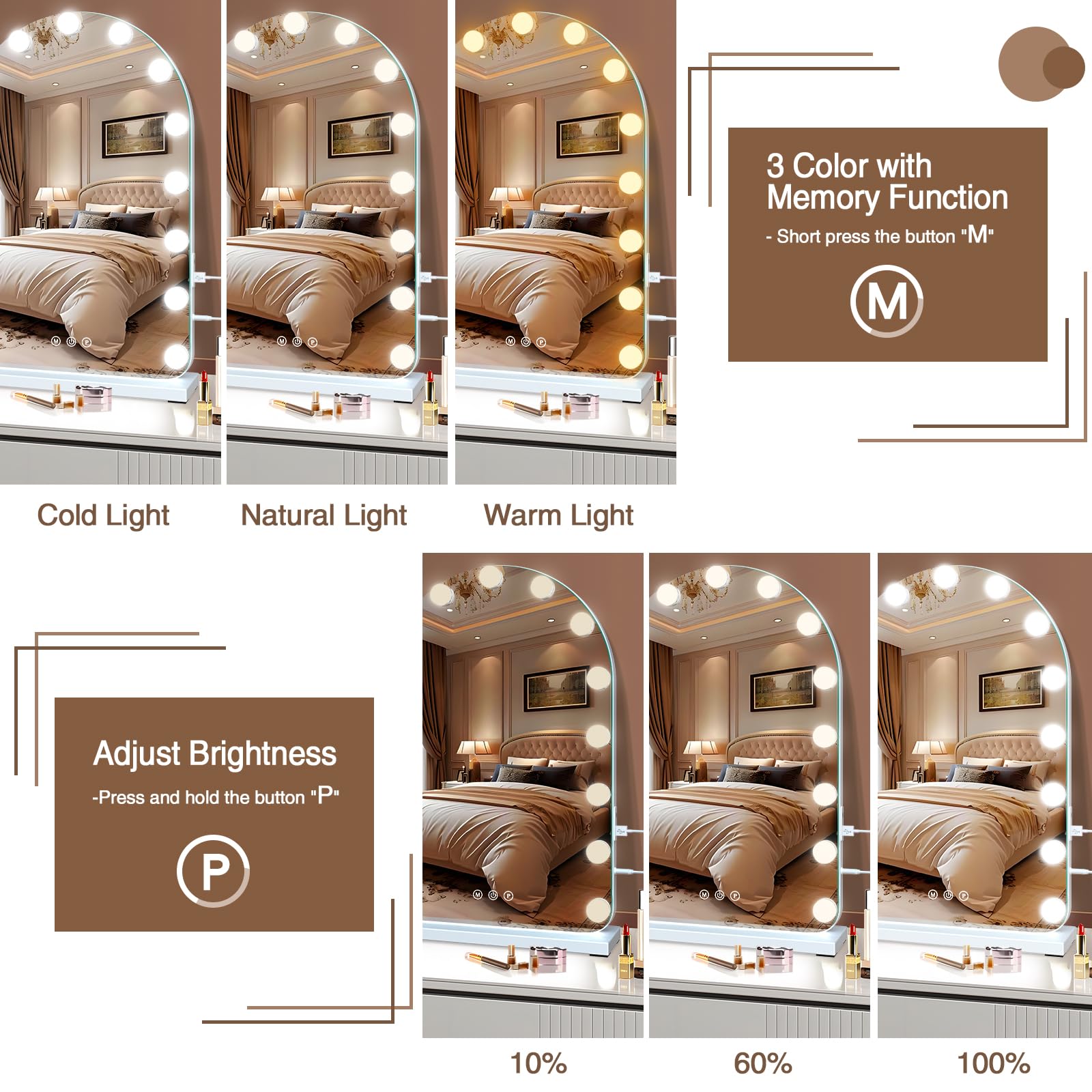 - 【Smart Touch Sensor & Memory Function】Smart touch buttons for this light-up vanity mirror, one touch to light on, 'M' for changing the lighting mode, and 'P' for adjusting the brightness. Get the perfect lighting for your makeup with our smart dimming feature. The memory function can keep your lighting settings as your last use, really convenient to use.