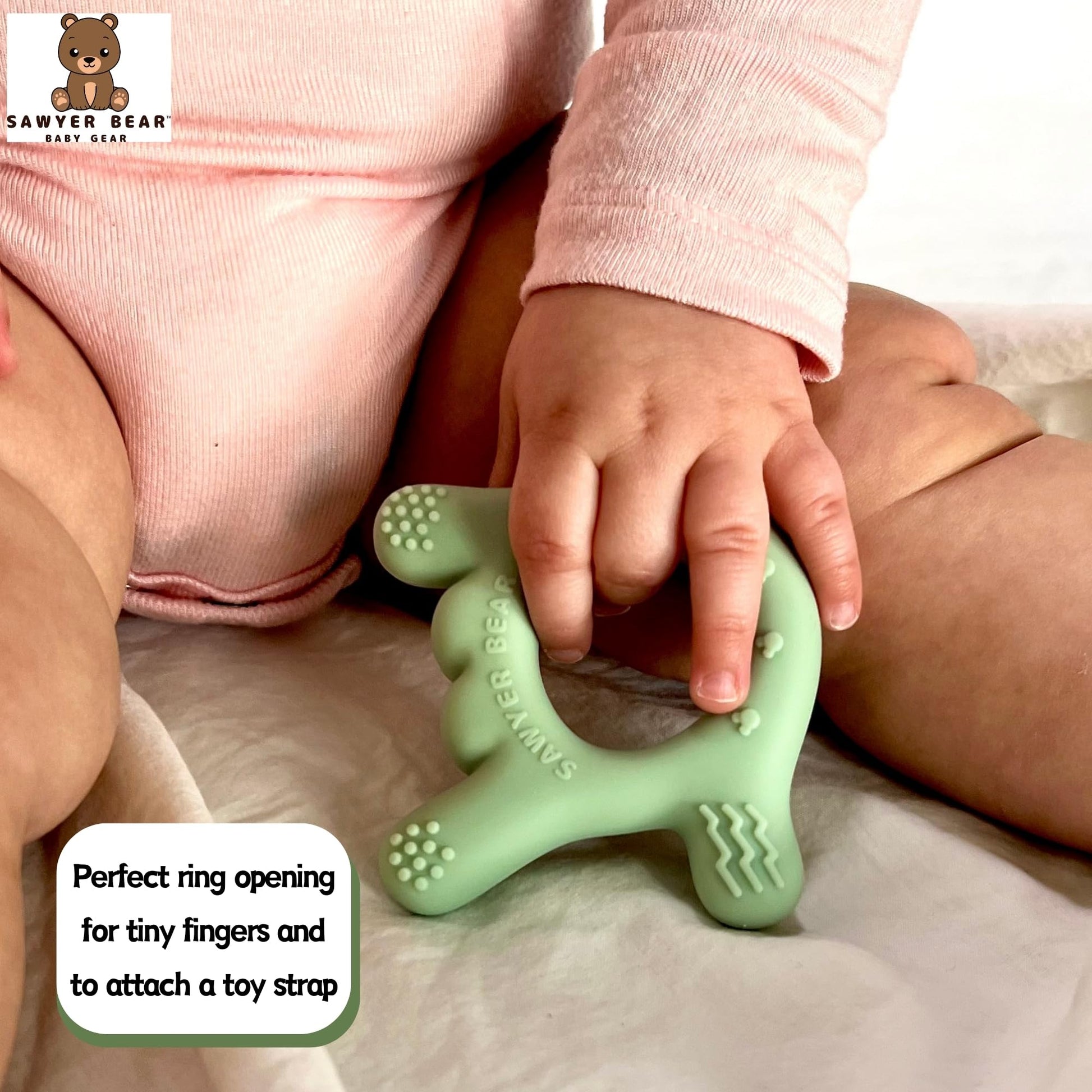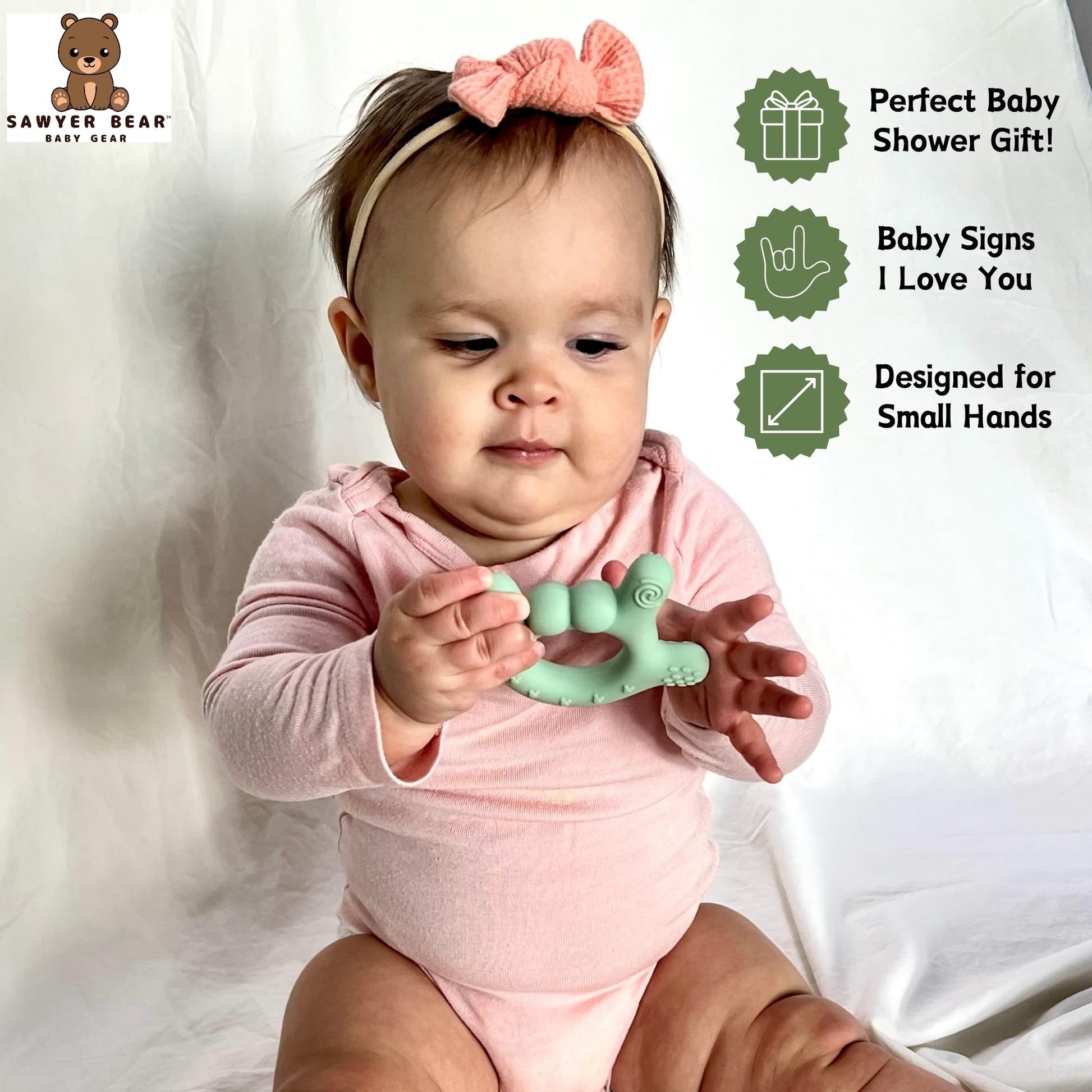 I Love You Silicone Hand Teether by Sawyer Bear Baby Gear, Teethers for Babies 3-6 Months, Soft Teething Toys 6-12 Months bpa Free, Massaging Teething Relief (Light Green)