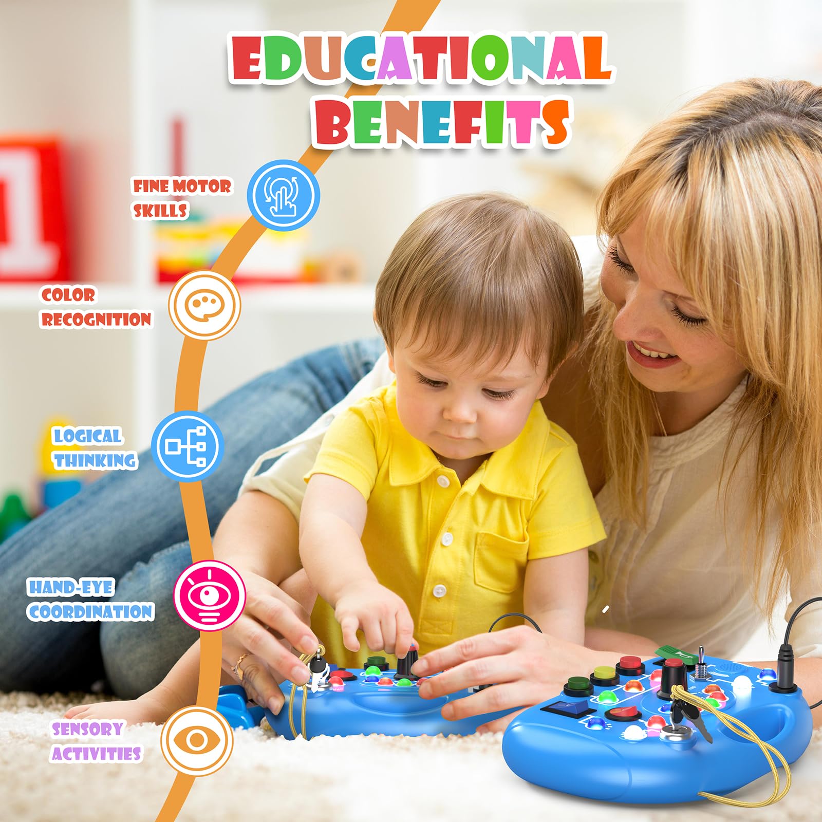 JIWORT Busy Board with LED Light, Montessori Busy Board for 1+ Year Old, Sensory Toys for Toddlers 1-3, Fidget Board Travel Toys for Kids Preschool Learning Activities Boys Birthday (Blue)