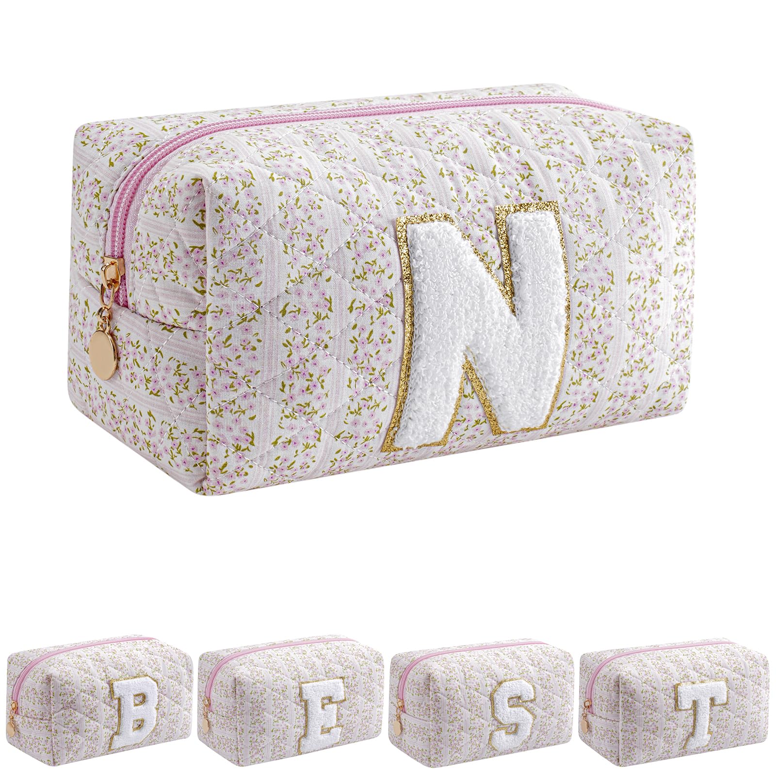JOVAKIT Alphabet Makeup Bag Cosmetic Bag for Women, Christmas Gifts for Girls Age 6-18, Floral Flowers Coquette Travel Toiletry Zipper Make Up Pouch Organizer Trendy Stuff (Blue Floral M)
