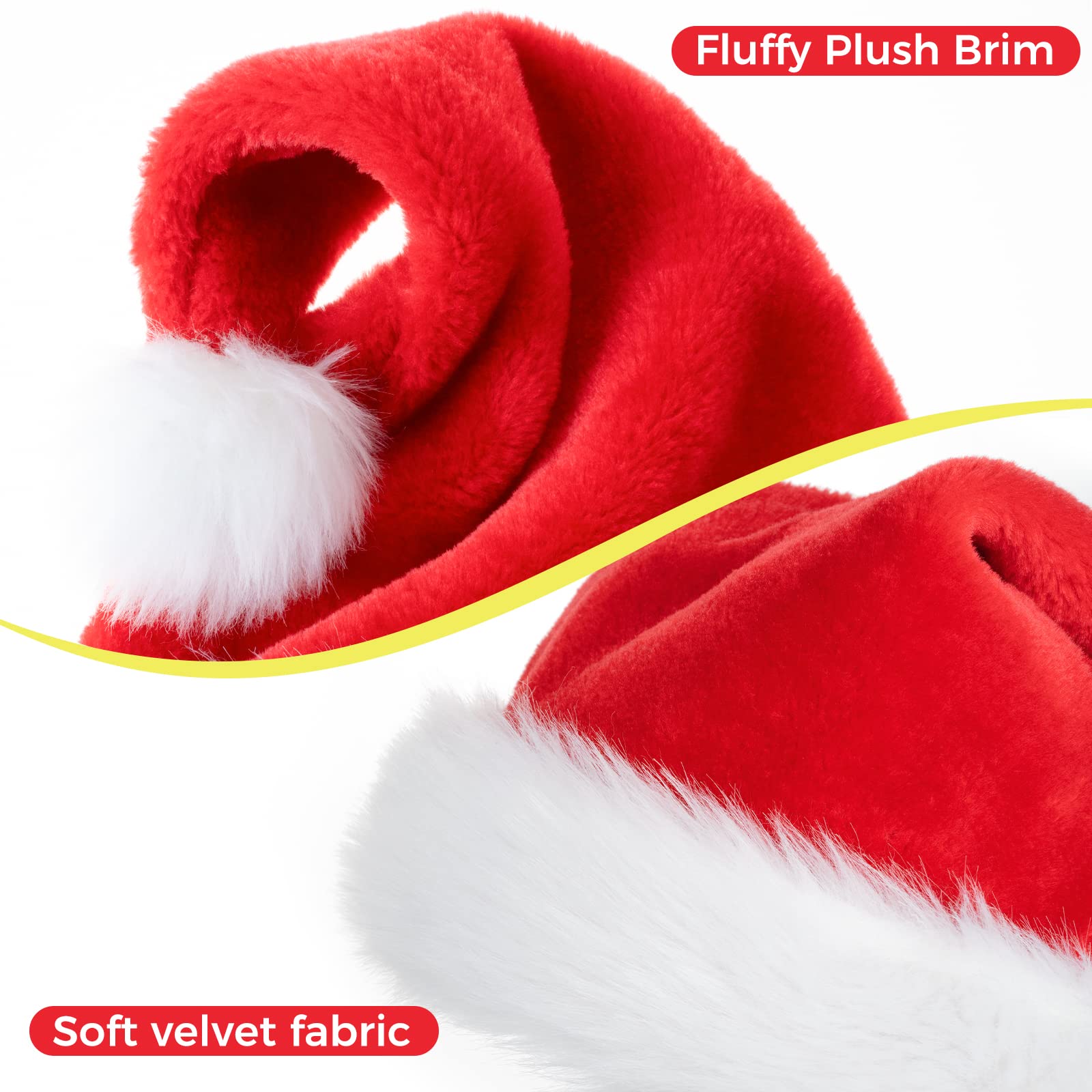 - ♥Soft & High Quality: Santa claus hat selected high quality red velvet to made this santa hat, 80% Velvet, 5% Lycra, 15% Plush. Soft comfortable fabric to protect your head and hair without irritation or sweat! We believe that you will fall in love with it because of its material.
