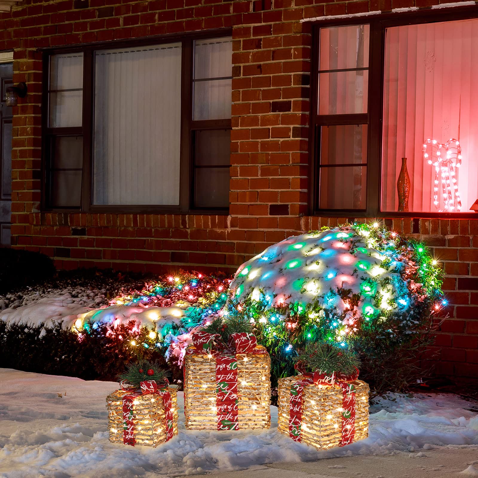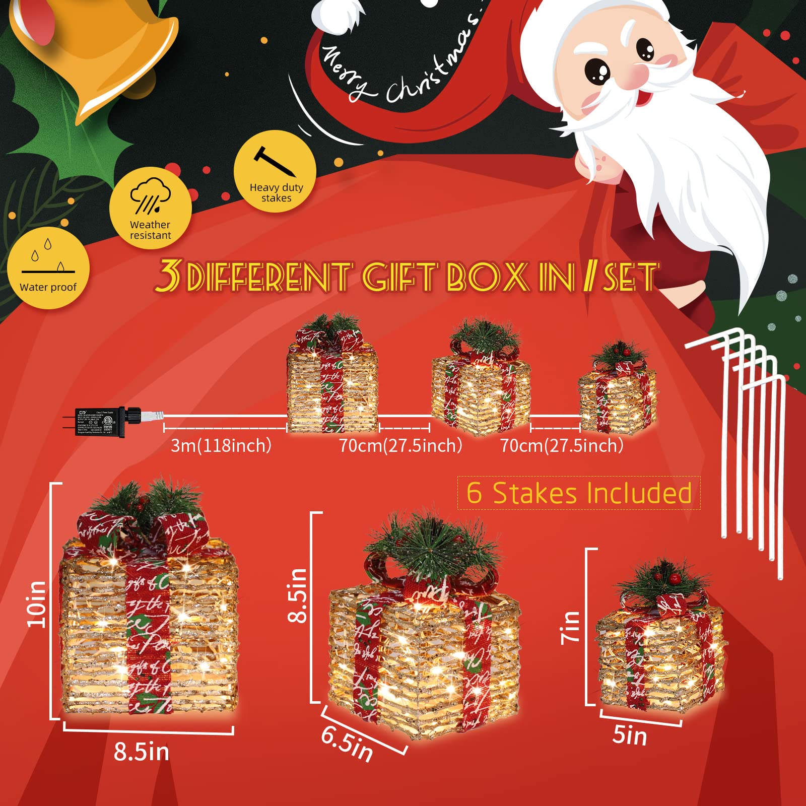Details: JUSTPRO 3 Piece Lighted Gift Boxes Christmas Decorations with 70 super-bright LED, Lighted Rattan Gift Boxes,Warm White Lights With Flashers,for indoor and outdoor Holiday,Party,Christmas,home Package Includes: 1 x Large box 8.5' x8.5' x10' 1 x Medium box 6.5' x6.5' x8.5' 1 x Small box 5' x5' x7' 1 x Instruction 6 x Stakes It is a great way to add a little sparkle to your display.