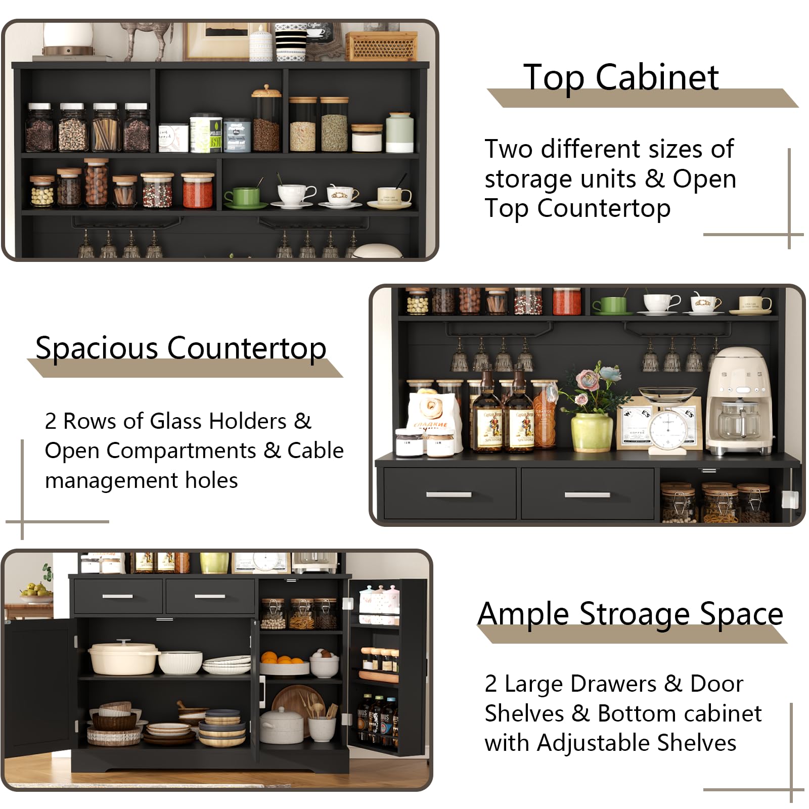 - [Large Pantry Cabinets for Kitchen Storage]-This kitchen hutch offers 10 compartments, 2 adjustable shelves and 2 rows of goblet holders, perfect for storing items of various sizes, keeping essentials organised. The spacious countertop and 2 smooth-gliding drawers can accommodate often-used items for easy access. It also includes a 3-layer door-side storage rack, perfect for spices, seasonings, and small items, streamlining kitchen organisation. A hole in the back helps you manage the wires.