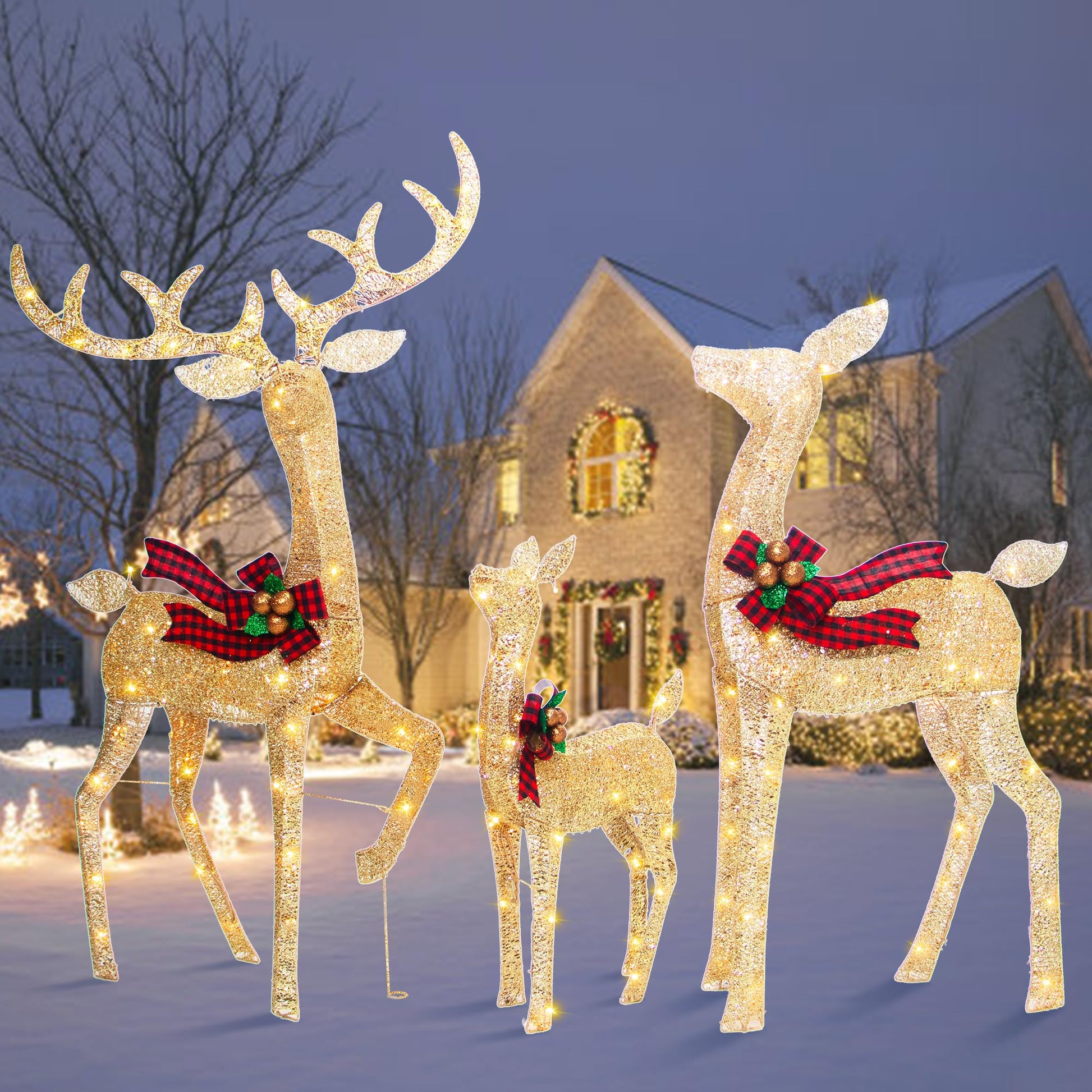 Large 3D Outdoor Christmas Reindeer Decoration Family Set - Gold Yellow Lighted Deer with 210 LED Lights for Patio, Lawn, Garden, Holiday Party