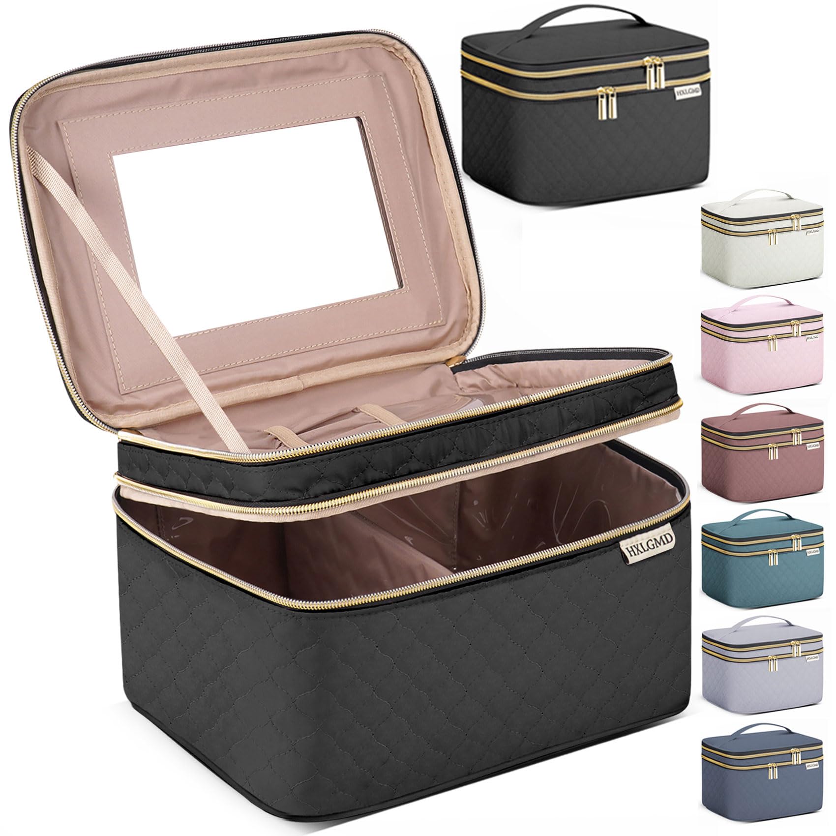 Large Makeup Bag with Mirror Double Layer Travel Make Up Organizer Case, Large Capacity Coemetic with Brush Slot Divider, Travel Toiletry Bag for Women (Pink)
