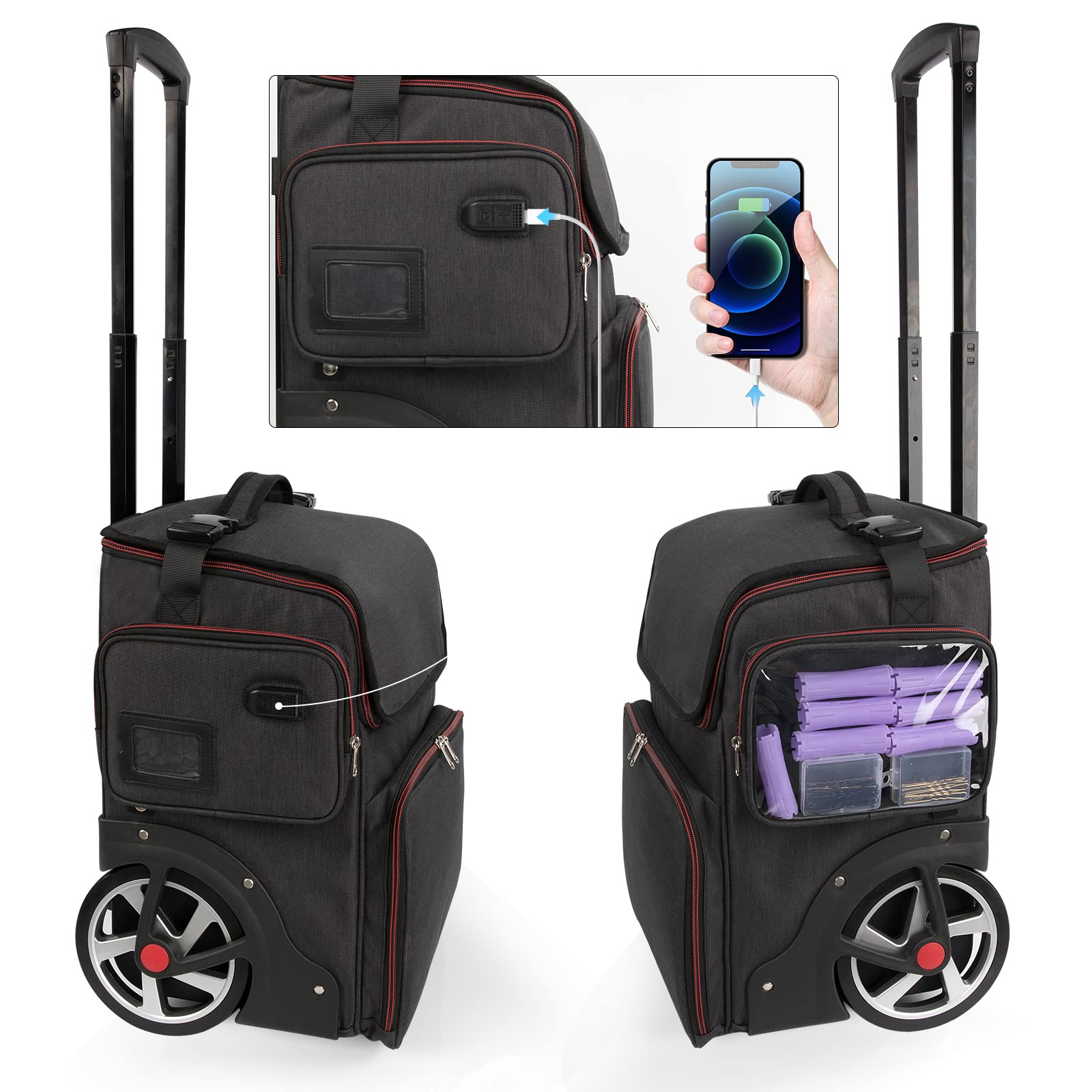 - Thoughtful Details Design - Hairstylist traveling case has following unique 1.the transparent detachable pouch can be taken off and placed on the tabletop.2. A dust-proof wheel pad prevents the tabletop from getting dirty. 3.the zipper is designed with a small zipper lock. 4.Name tag or business card can be placed in the side pouch, 5.external USB charging port and built in charging cable, offers you a convenient way to charge your Electronic accessories while traveling
