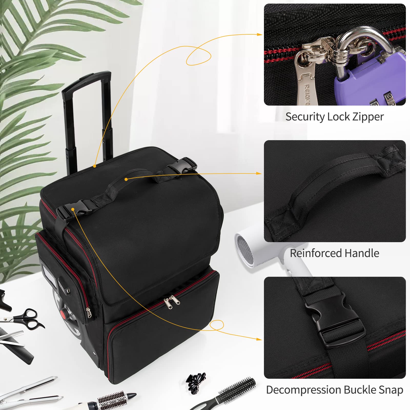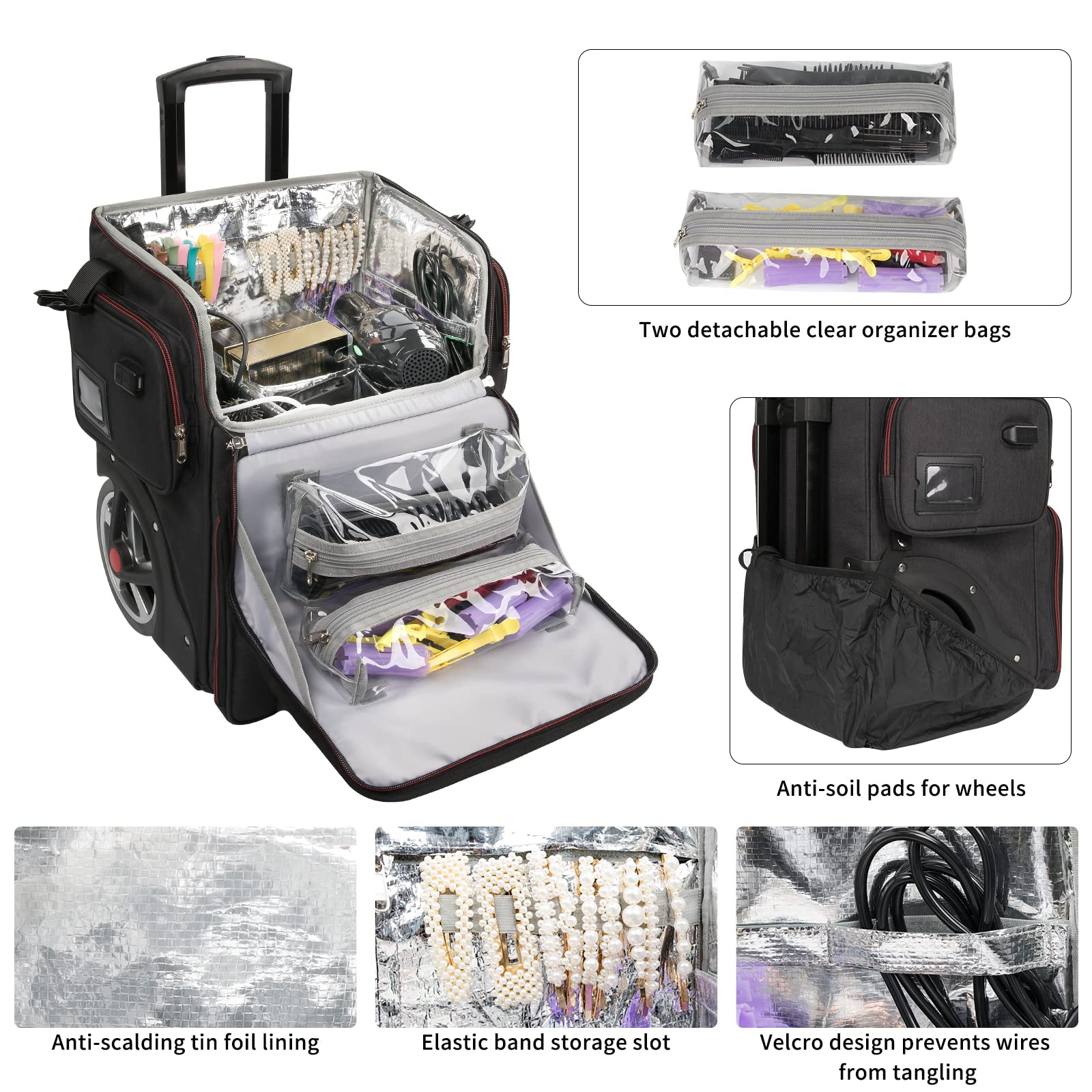 Large Makeup Train Case,Cosmetic Makeup Case for Hairstylist, Hairdresser Bag with Detachable Pouch,Heat Insulation and Anti-scalding Full layer for Hairdressing Tool Organizer Trolley with wheels