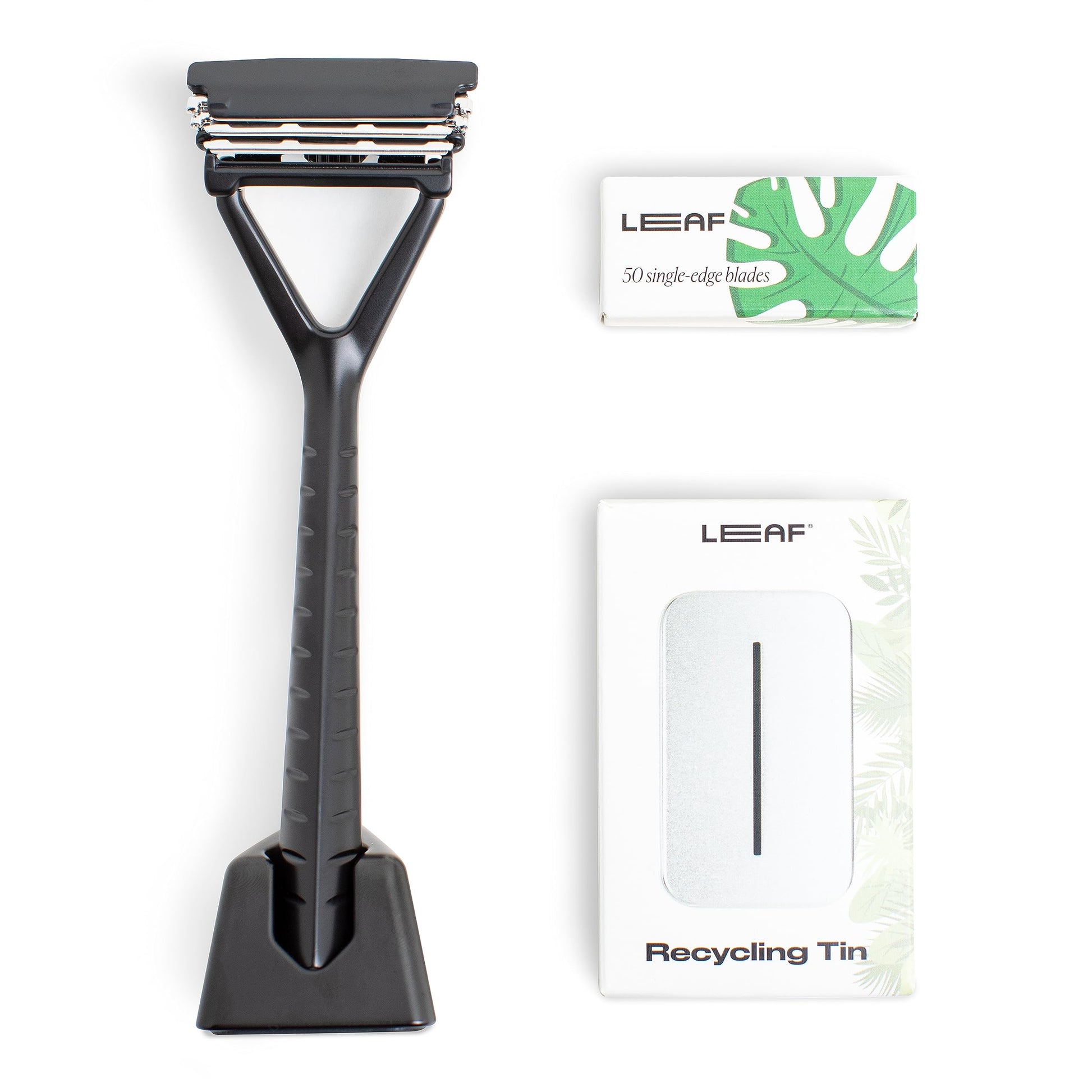 - Leaf Razor Set Includes: 1x Leaf Razor, 1x Matching Leaf Razor Stand, 1x 50-Pack of Single-Edge Razor Blades, and 1x Blade Recycling Tin