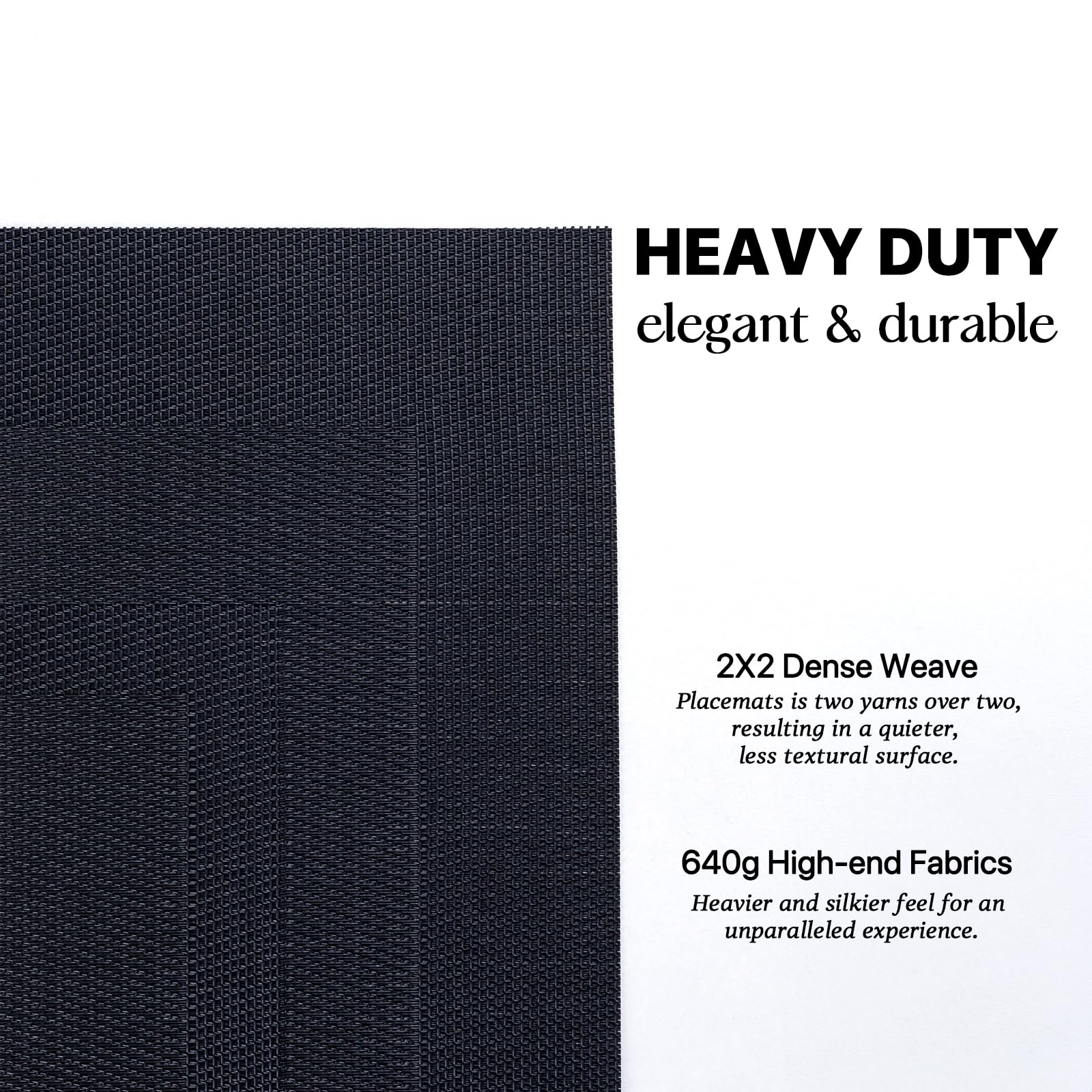 - HEAVY-DUTY:We uses the German-imported higher grammage vinyl material (Specialty PVC)than other placemats on the market,plus the precise,dense weave craftsmanship to give the woven placemats a thicker feel and make the place mats long-lasting.