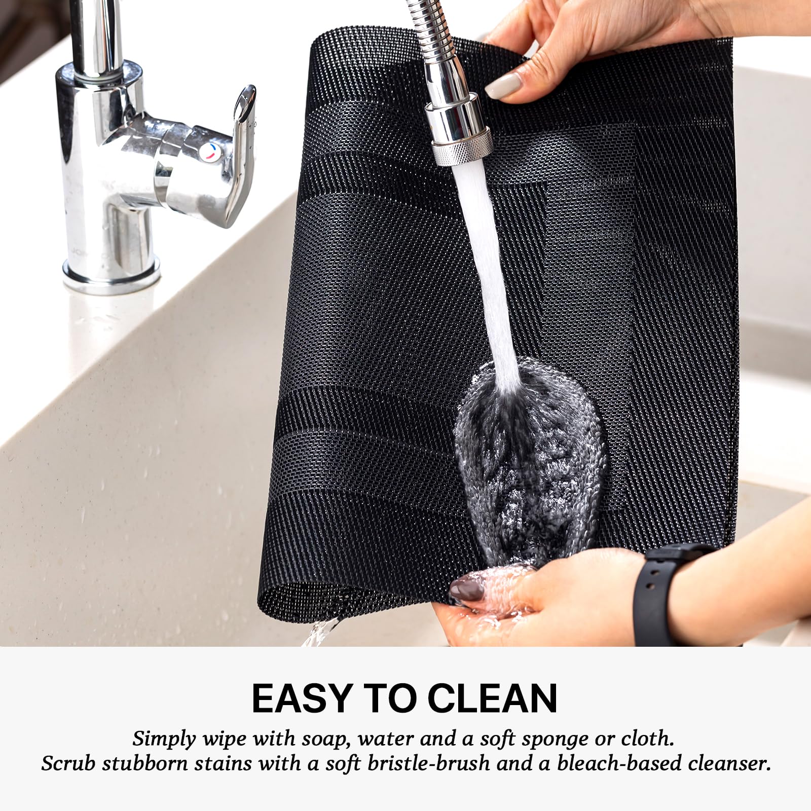 - EASY TO CLEAN:The washable placemats can be washed repeatedly.How to clean the place mats for kitchen table:Simply wipe with soap,water and a soft sponge or cloth.Scrub stubborn stains with a soft bristle-brush and a bleach-based cleanse.