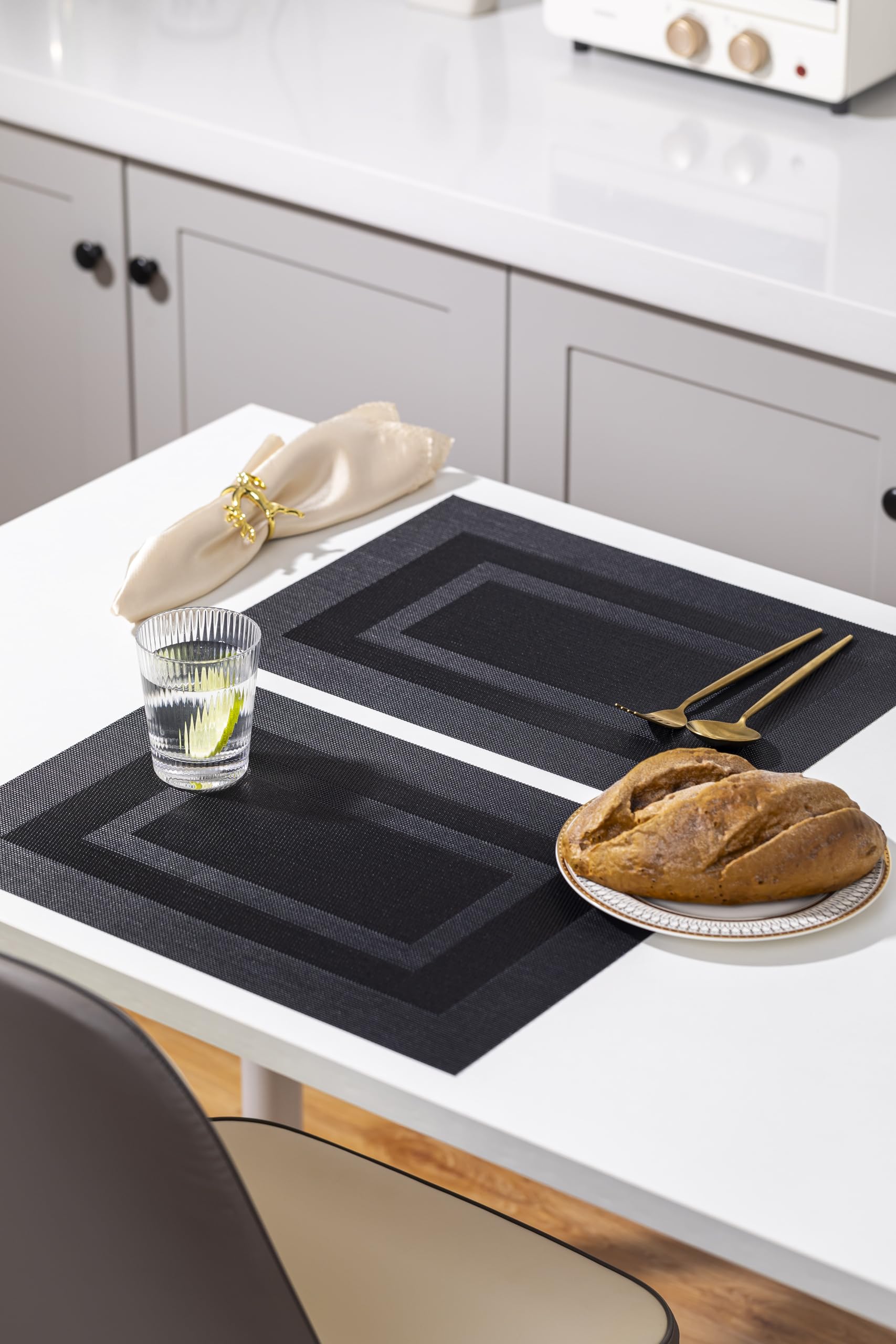 - PERFECT FOR INDOOR AND OUTDOOR:The wipeable placemat is two yarns over two, resulting in a quieter,less textural surface.The neutral color scheme and the classic size (about 12*17 inch)makes the whole table elegant and stylish full of texture!