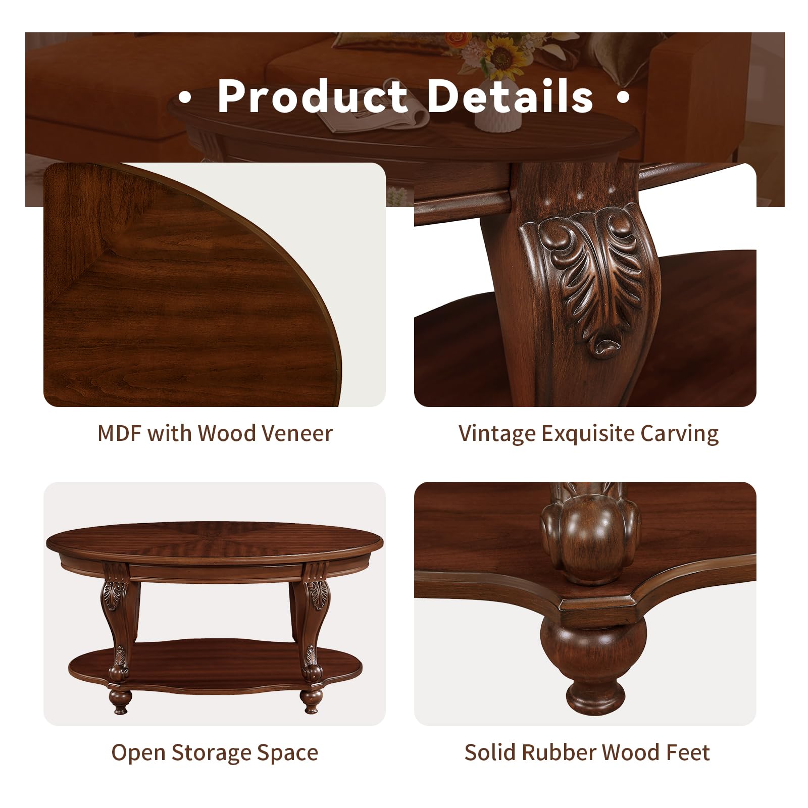- Vintage beautiful appearance: Elevate your home decor with the LKTART 42' Oval Vintage Coffee Table. Crafted with applique on the top tabletop and elegant floral carvings on the antique legs, this coffee table adds a touch of sophistication to any living room.
