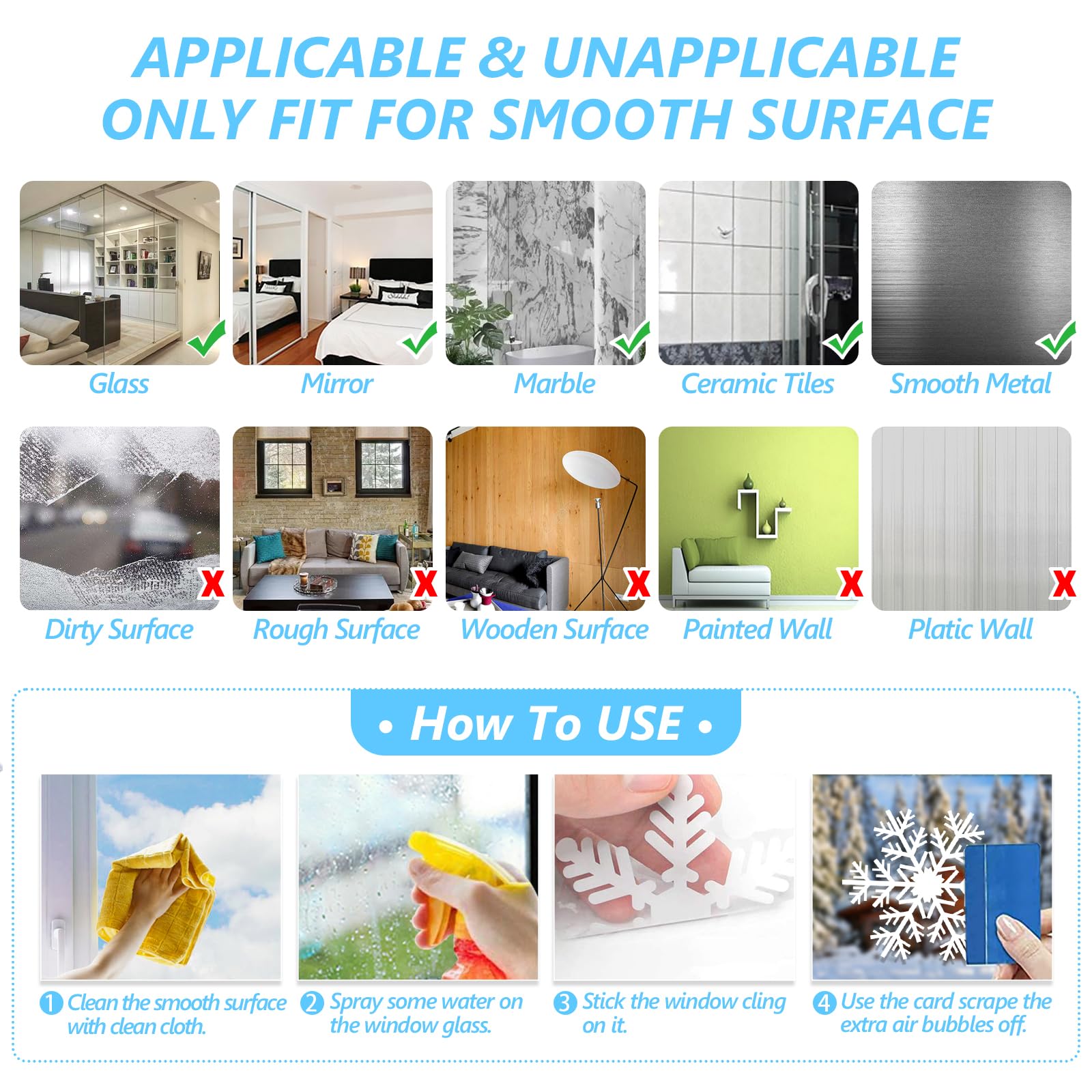 - PERFECT FOR ANY SMOOTH SURFACE: Christmas snowflakes window clings, fit for any smooth surface: sliding glass door, glass window, shop window, ceramic tiles, home appliance, etc. Great as Christmas stickers, Xmas decals, Static snowflakes stickers, snowflakes decals decorations, make amazing Christmas party supplies, Xmas decorations indoor ornaments, holiday home décor.