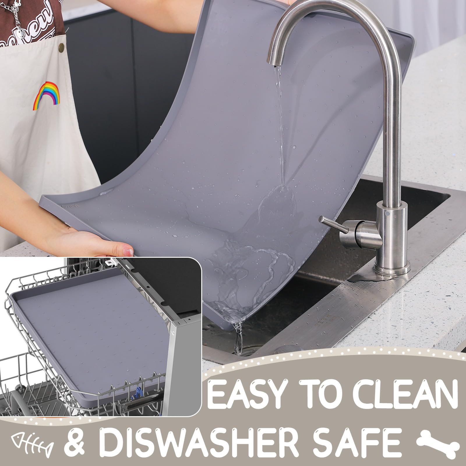 - Easy to Clean & Dishwasher Safe: You can fold the pet bowl mats for food and water to discard crumbs and rinse them down in a sink without deformation. Alternatively, the dog water matt for sloppy drinkers and dog matt for food and water bowl can be wiped down with a wet cloth. The pet water mat for dog bowl is also safe to clean in a dishwasher. If you have energetic pets, you can put the silicone pet food mats waterproof with edge under the pet food bowls every mealtime as they dry up quickly
