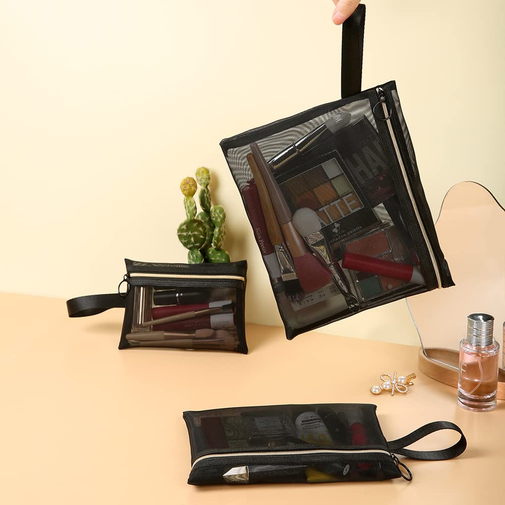 Mesh Cosmetic Bags with Zipper and Handle, Breathable Organization Pouch Pocket for Travel Purse Makeup Toiletry Office Home to Storage Items, 3pcs Black Assorted Sizes 9x8 8x6 6x4 inch