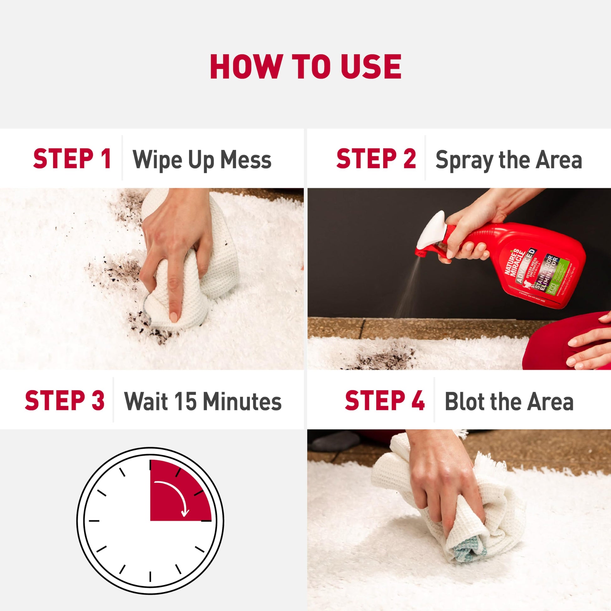 Details: Nature’s Miracle pet stain and odor removers have been a trusted brand for pet mess cleanup for more than 35 years. Whatever pets do, you can trust Nature’s Miracle stain and odor removers, training aids, disinfectants and litter products to undo. Accidents happen, as every dog owner knows. Nature’s Miracle Advanced Stain & Odor Eliminator for dogs is an enzymatic, severe-mess stain and odor remover that actually discourages re-soiling by removing the odor of even the toughest dog messes. Bacteria-based formulas produce enzymes when they come into contact with a food source – pet urine, feces, vomit and other bio-based messes. This enzymatic cleaner continues working as long as the food source is present. Freshens with a light fresh scent. Use on carpets, hard floors, furniture, fabrics and more (see the product label for a complete list of fabrics). Do not use on untreated hardwood, leather, suede, silk or wool specialty fabrics. Always use this product at full strength. Just spray, wait 10 minutes, then blot up stain with a white cloth. When used as directed, this product is safe to use around your pets and in your home. Always use Nature’s Miracle products first. Other cleaners and detergents may fail and chemically “set” stains that will be impossible to remove.