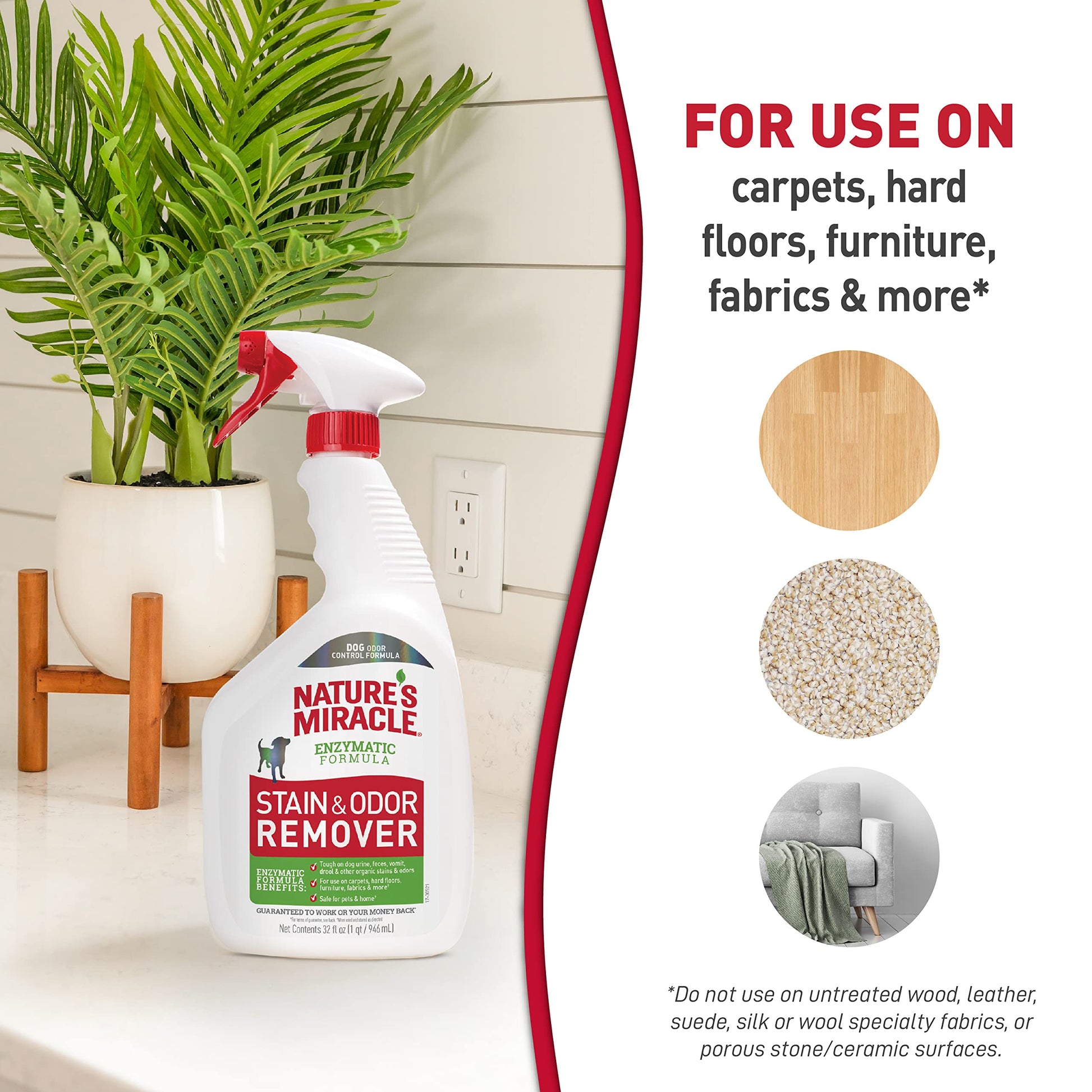 Details: Nature’s Miracle® pet stain and odor removers have been a trusted brand for pet mess cleanup for more than 35 years. Whatever pets do, you can trust Nature’s Miracle stain and odor removers, training aids, disinfectants and litter products to undo. Accidents happen, as every dog owner knows. Nature’s Miracle Stain & Odor Remover for dogs is an enzymatic spot stain and odor remover that’s tough on dog urine, feces, vomit, drool and other organic stains while freshening with a light citrus scent! Bacteria-based formulas produce enzymes when they come into contact with a food source – pet urine, feces, vomit and other bio-based messes. This enzymatic cleaner continues working as long as the food source is present. Use on carpets, hard floors, furniture, fabrics and more (see the product label for a complete list of fabrics). Do not use on untreated hardwood, leather, suede, silk or wool specialty fabrics. Always use this product at full strength. Just spray, wait 10 minutes, then blot up stain with a white cloth. When used as directed, this product is safe to use around your pets and in your home. Always use Nature’s Miracle products first. Other cleaners and detergents may fail and chemically “set” stains that will be impossible to remove.