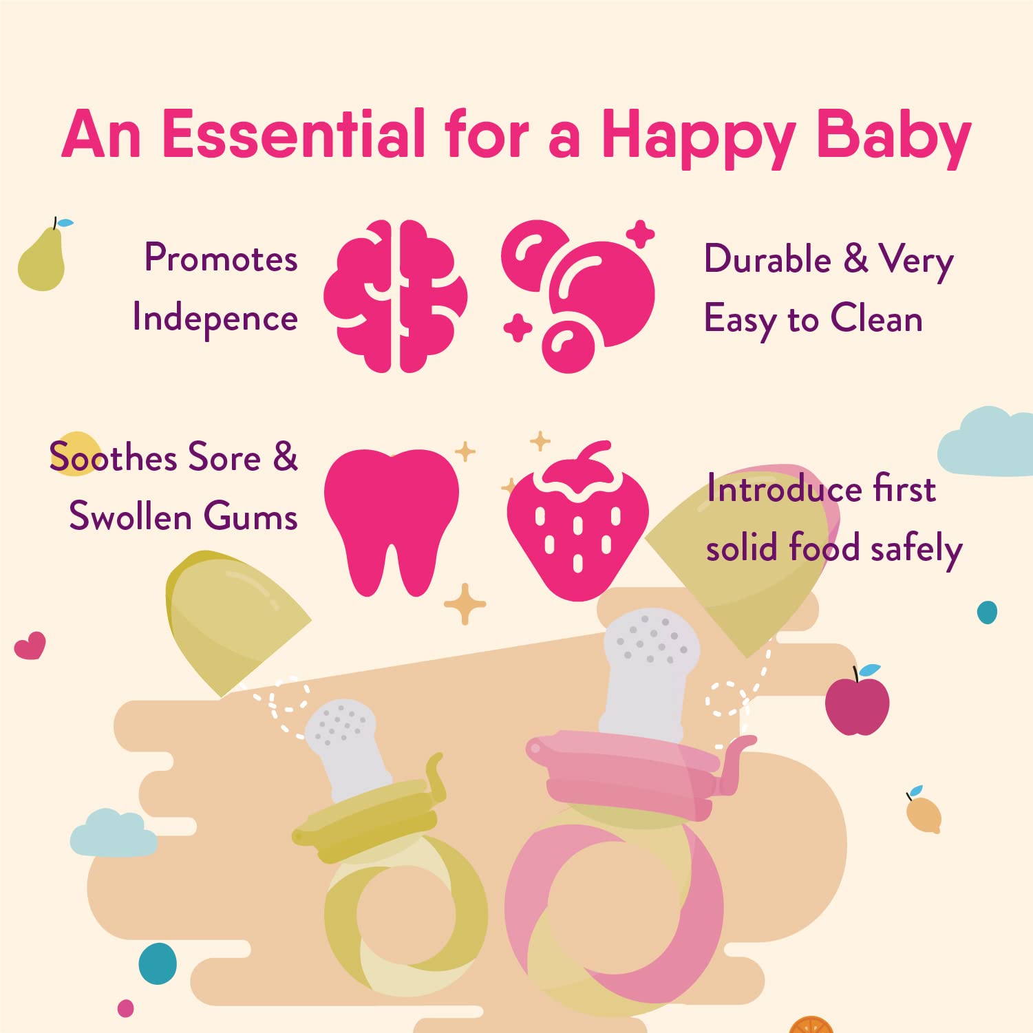 - ★ MOST VALUE FOR MONEY BABY FRUIT / FOOD FEEDERS & TEETHERS (2 PCS w 4 Silicone Teats) – NatureBond Baby Fruit Feeders and Teethers are designed in 'APPETIZING' candy-like colors that stimulate baby’s appetite for consumption of natural nutrients from fruits and vegetables. It is also a safe way to introduce our little ones to solid food while they go through weaning and teething phase. The All-IN-1 feeder can also soothe baby's teething discomfort by massaging the gums through chewing.