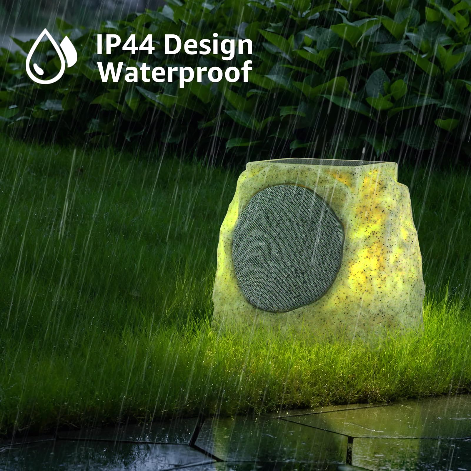 - Outdoor Speakers IP44 Water-Resistant: This outdoor speaker features a standard IP44 Water-Resistant design. The rock solid exterior of the speaker can withstand all weather conditions. You can put them in the rain, snow or harsh sunlight, and it will work fine. At the same time outdoor rock speakers faux rock design can blend perfectly with your garden, patio or backyard while providing you with beautiful, lively music
