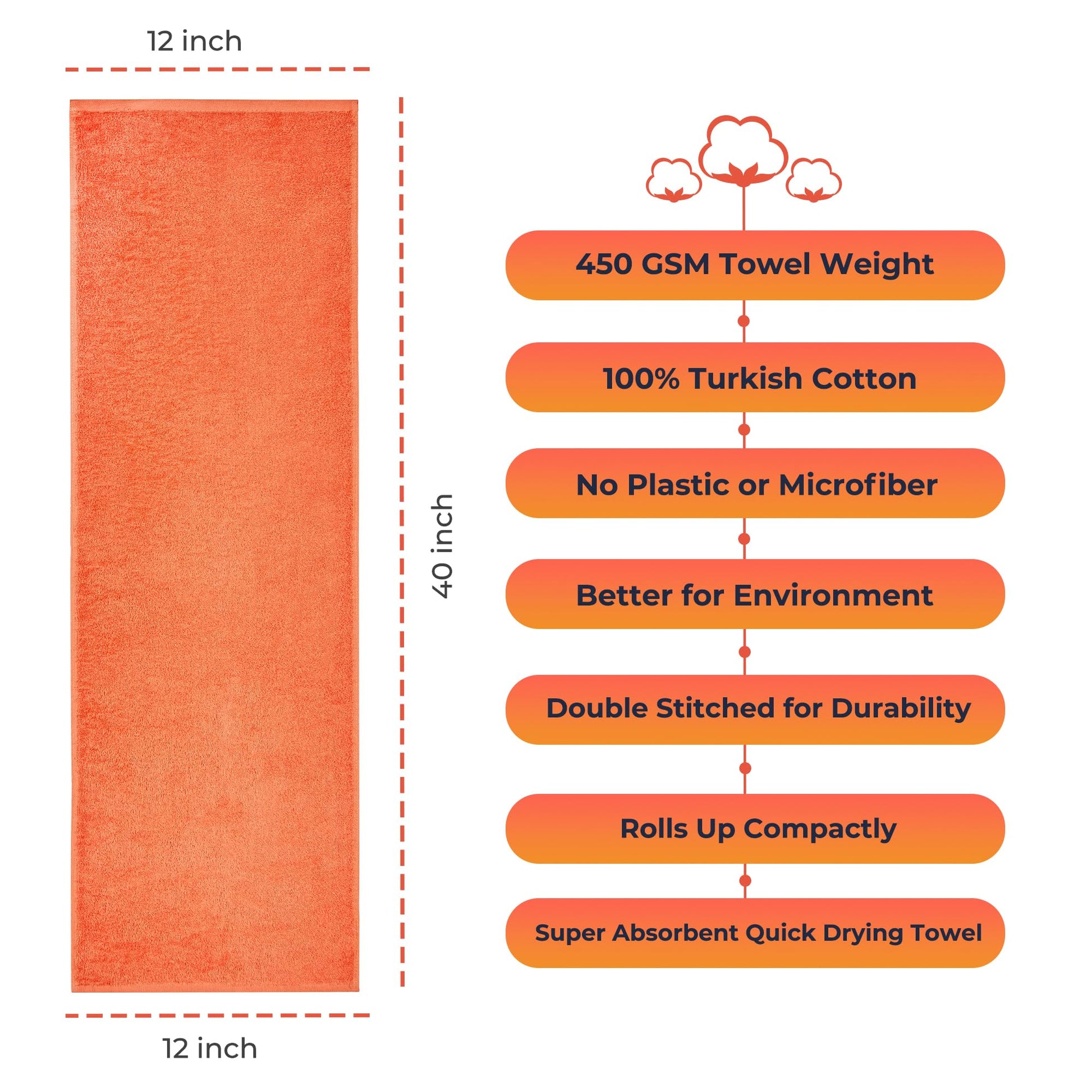 - GENEROUS SIZE: With a substantial 12' x 40' size and 450 GSM weight, our sweat towel delivers a nice and silky touch to your skin while keeping you dry and motivated during your workout.