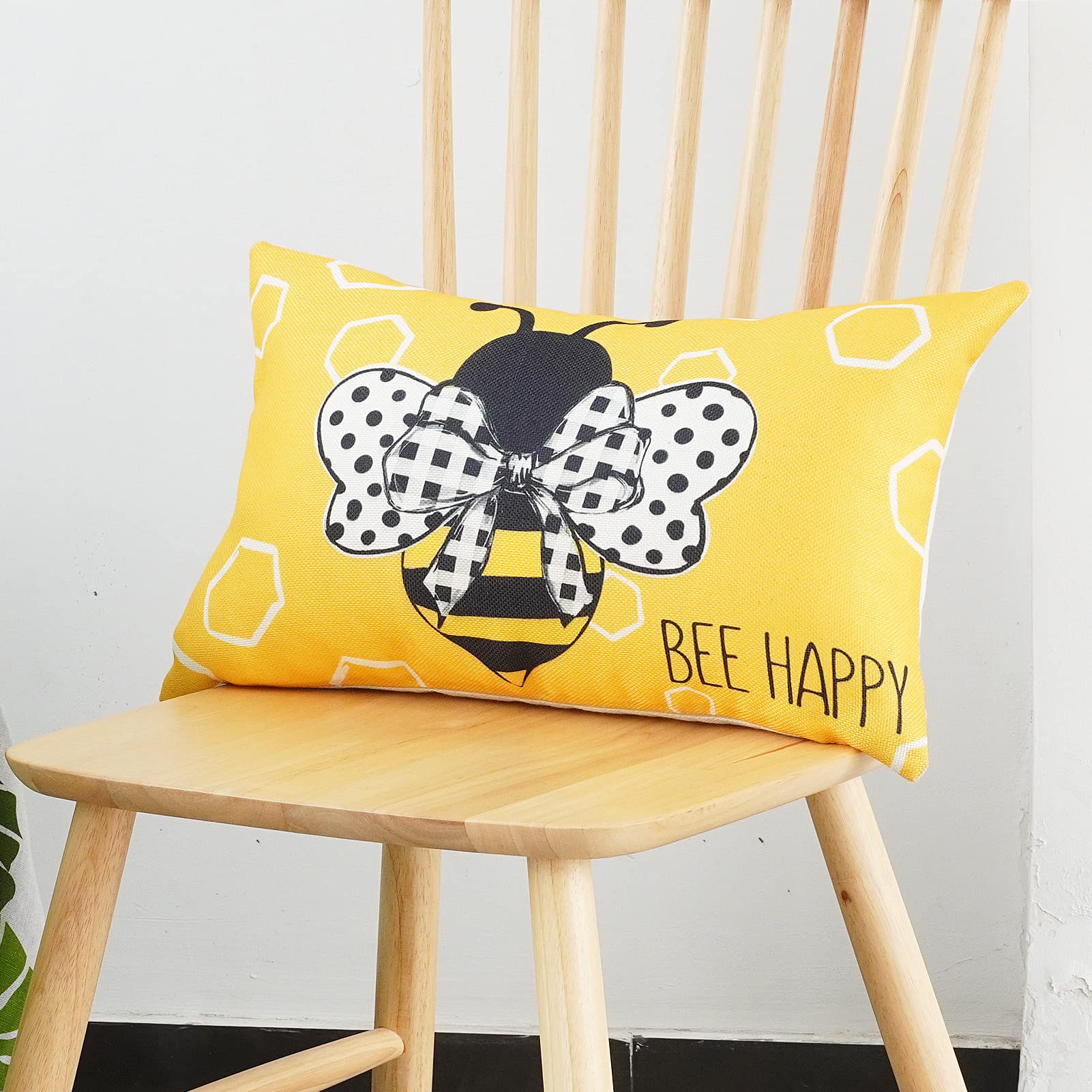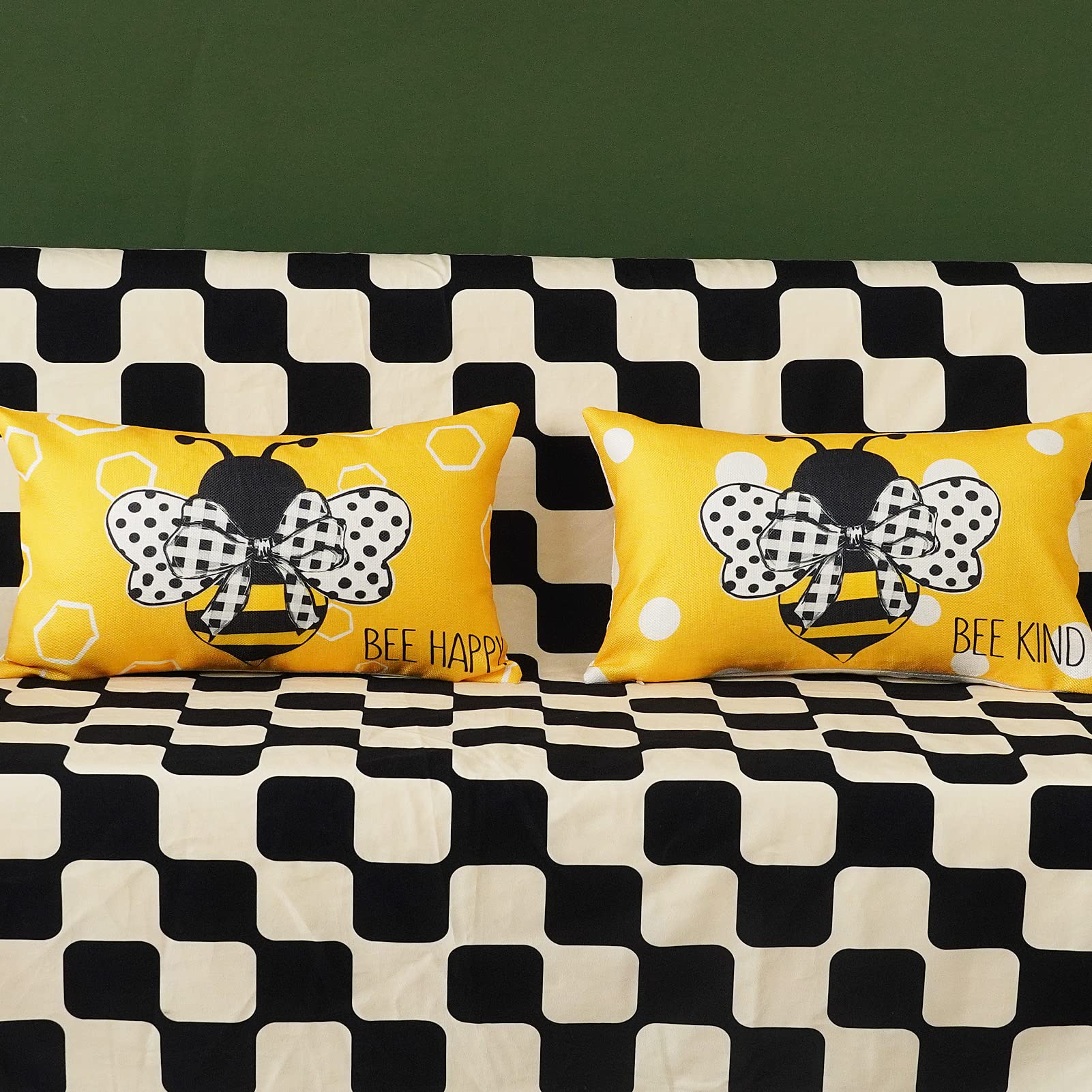 ONWAY Bees Summer Throw Pillow Covers 12x20 Inch Set of 2 Stripes Polka Dots Honey Bee Yellow Decorative Lumbar Farmhouse Cushion Case for Sofa Couch Home Bed