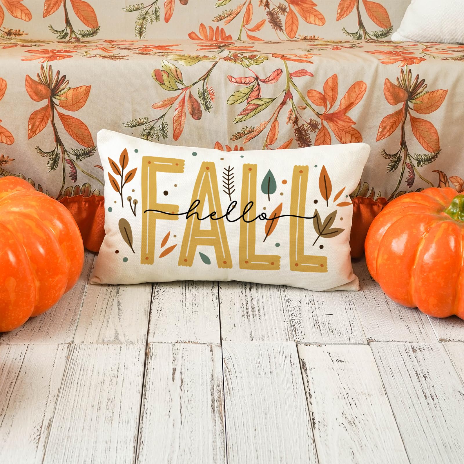 ONWAY Fall Throw Pillow Cover 12x20 Hello Fall Autumn Decorative Pillowcase for Couch Sofa Farmhouse Thanksgiving Rustic Maple Leaf Cushion Cover for Home Decor