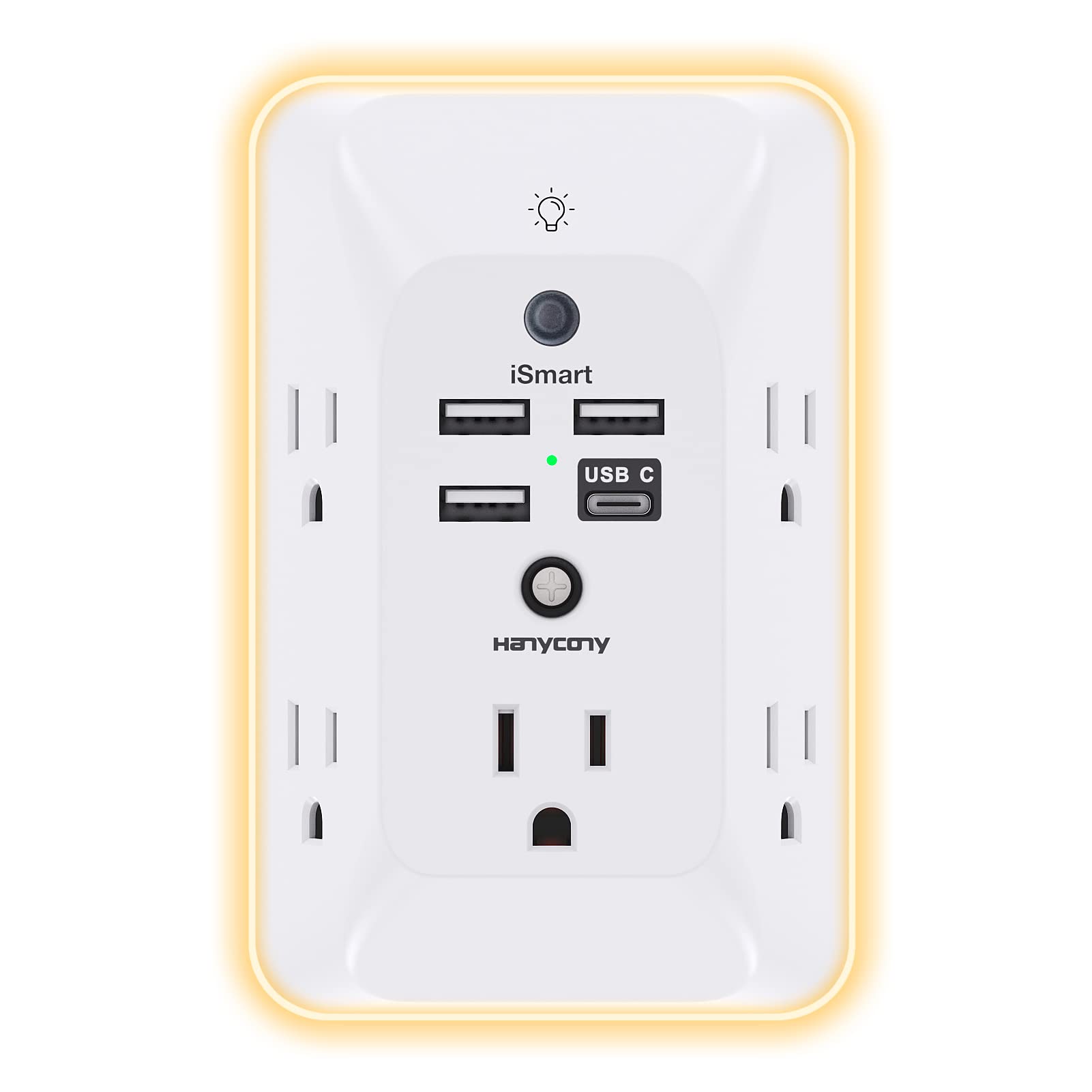 - 【Versatile 10 in 1 Outlet Extender】- 4 usb charging ports, 5 wide spaced outlets, 3 side power stip provides large space and saves you another charger head space. 360°night light around makes it easy for you to see the outlets in dark corners or at night. With the removeable screw and the plastic prong, the multi plug outlet is firmly attach to your DUPLEX and DECOR outlets, and perfect for bedroom, dorm room etc
