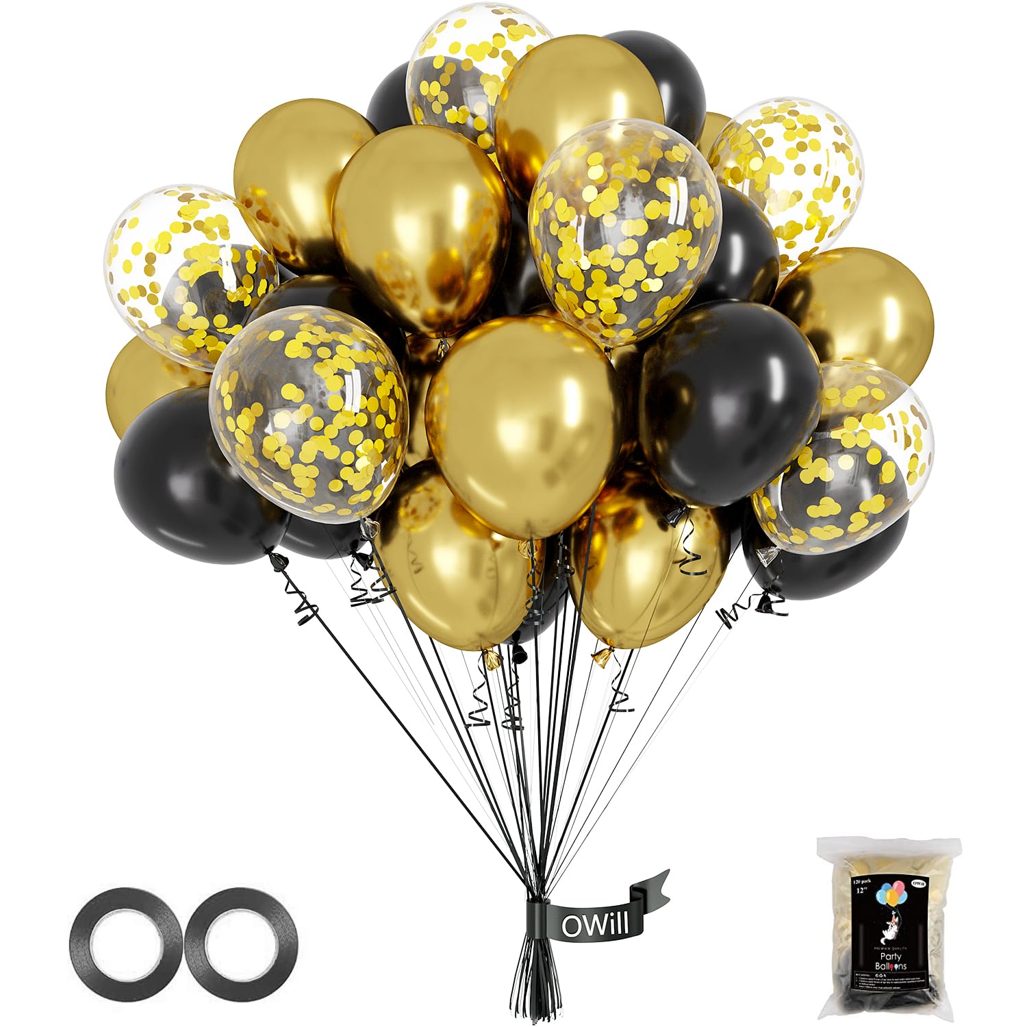 OWill Black and Gold Confetti Balloons, 100pcs 12 Inches Black and Gold Balloons for Birthdays, Graduation Decorations, Weddings & Arches, Garlands & Party Decorations
