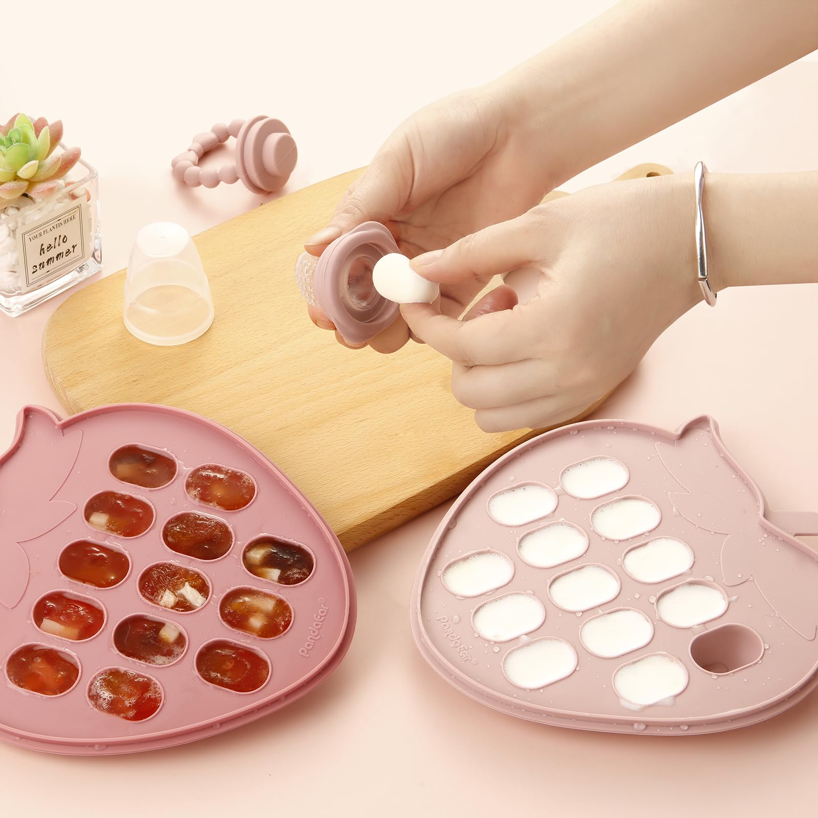 Details: PandaEar 2 Pack Silicone Freezer Tray offers an effortless solution for preparing and storing baby food. Designed in a charming strawberry shape, these trays allow you to batch prepare baby food, purees, breastmilk, and more with ease. Made from flexible, non-stick silicone, they ensure easy food release and are dishwasher-safe and boil-proof for hassle-free cleaning and durability. The premium silicone lids with secure clips enable easy stacking and prevent messy spills in the freezer, while BPA-free materials ensure safety. Each tray features 14 individual 0.5 oz pods for precise portion control, and reinforced support walls provide stability and prevent crushing when stacked.
