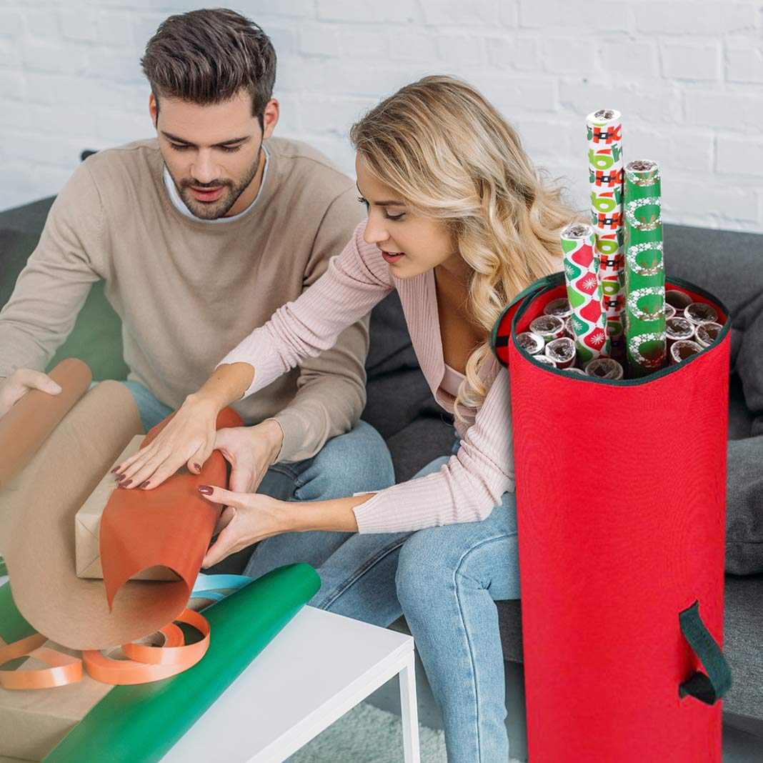 - Our wrapping paper storage bag is finished with festive shades of red and green that make it easy to spot.