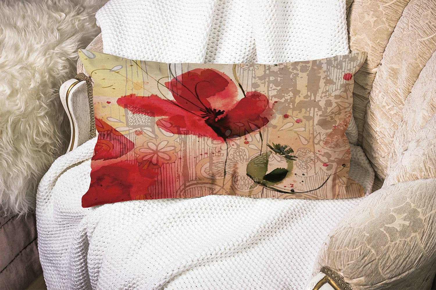 Smooffly Flower Pillow,Home Decorative Throw Pillow Cover Red Poppy Flower Beige Floral Waist Lumbar Cotton Linen Throw Pillow case Cushion Cover Sofa Home Decorative Rectangle Oblong 12x20 Inches