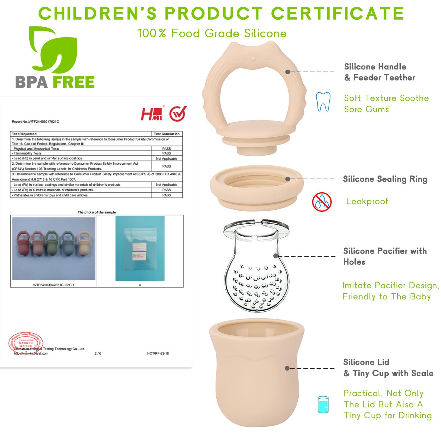 - Introduce Solids to Baby- Soft silicone pouch with small holes allows only small, digestible pieces to pass through, making it a great tool to introduce new flavors without the risk of choking. The lid of the fresh fruit feeder can also be used as a water cup, just right for small hands.