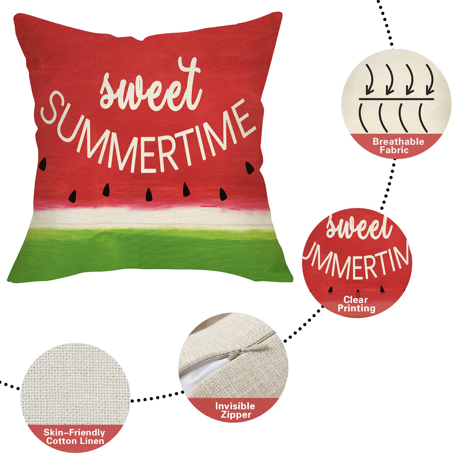 Softxpp Sweet Summer Time Decorative Throw Pillow Cover, Red Watermelon Sign Cushion Case Seasonal Rustic Home Decorations, Green Farmhouse Square Pillowcases Cotton Linen Decor for Sofa Couch 18 x 18