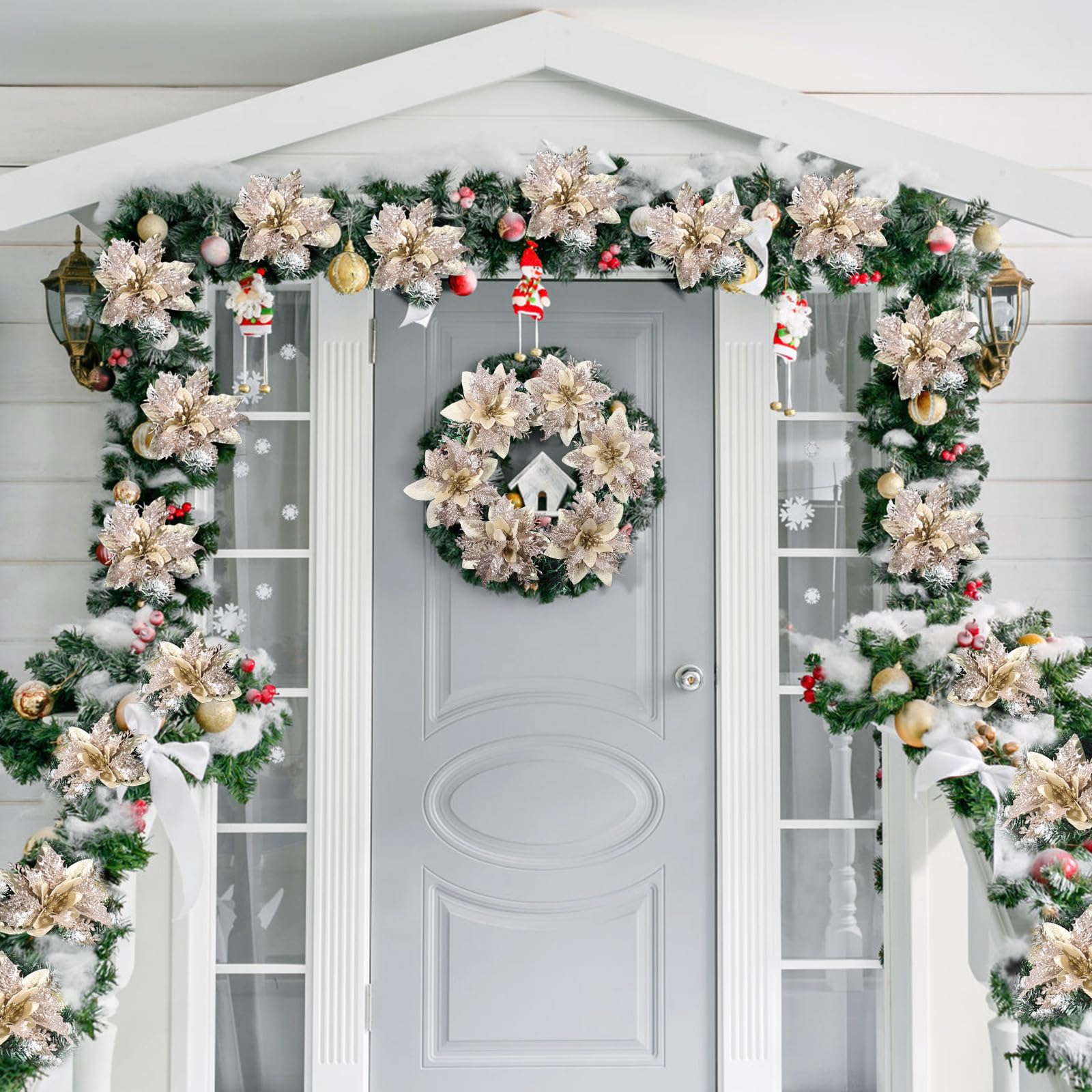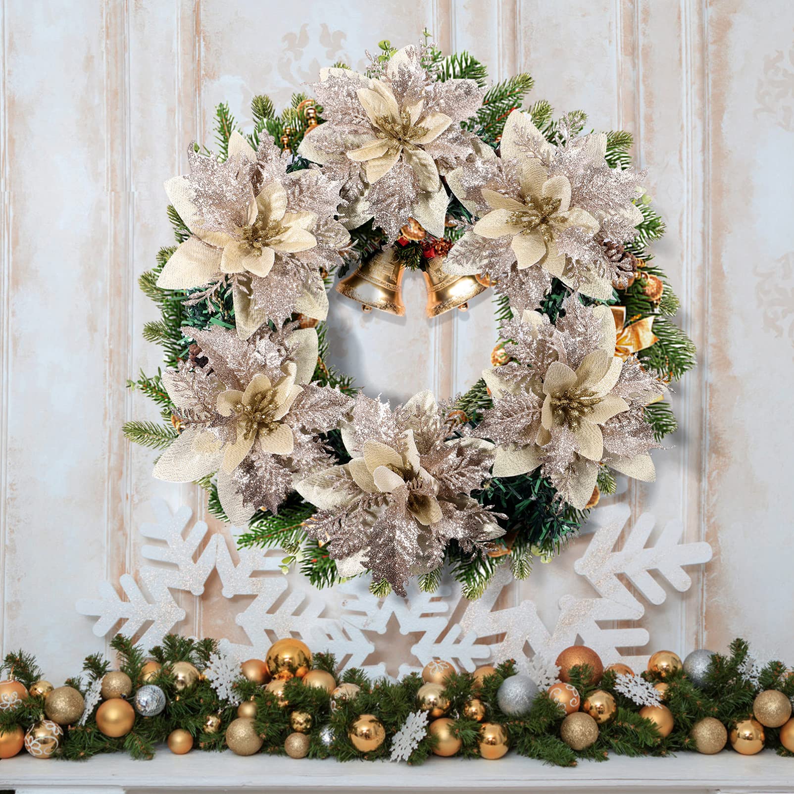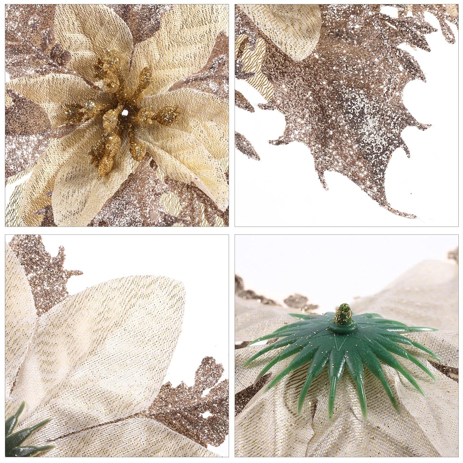 - 🎅Glitter Poinsettia Flowers - Each Christmas flowers covered with many . Glitter bunches of round anthers and filaments protrude from their centers. Layering pointy- tipped petals join to create elegant sparkling blooms.