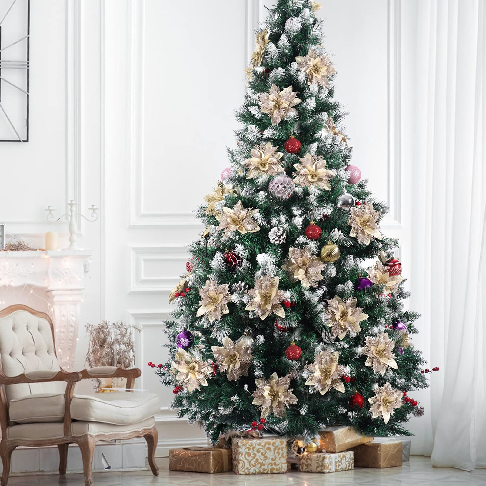 - 🎄12 Pack Glitter Christmas Poinsettia Flowers - The Christmas poinsettia decorations include 12 color Christmas glitter poinsettia flowers. Approx 6 inch diameter. Get Christmas tree theme ready for glitters galore poinsettia flowers.