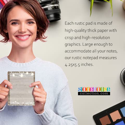 - ONE PACK OF NOTEPADS GOES A LONG WAY: Each pack contains 4 Stonehouse Collection Rustic Notepads, each featuring a unique rustic wood theme design on every sheet. A cute rustic notepad measures 4.25 x 5.5 inches and has 50 sheets. You will get 200 sheets of paper from one pack that could last a long time.