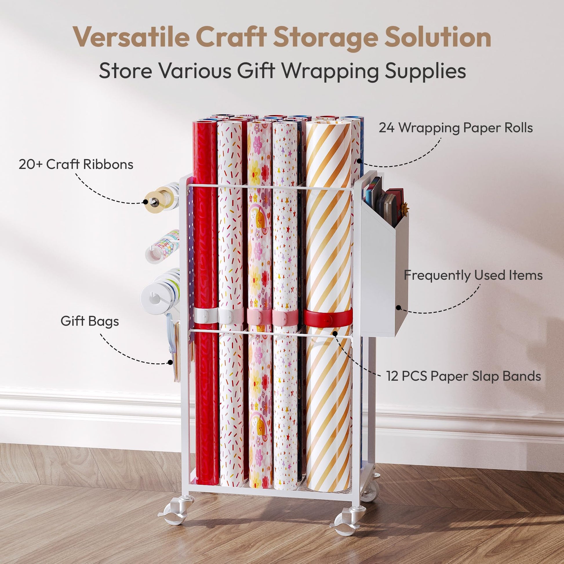 Sunnacate Wrapping Paper Organizer Cart with 12PCS Slap Bands, Rolling Gift Wrapping Organizer Storage Wrapping Paper Station Ribbon Holder, Blueprint Poster Holder, Craft Organizers and Storage