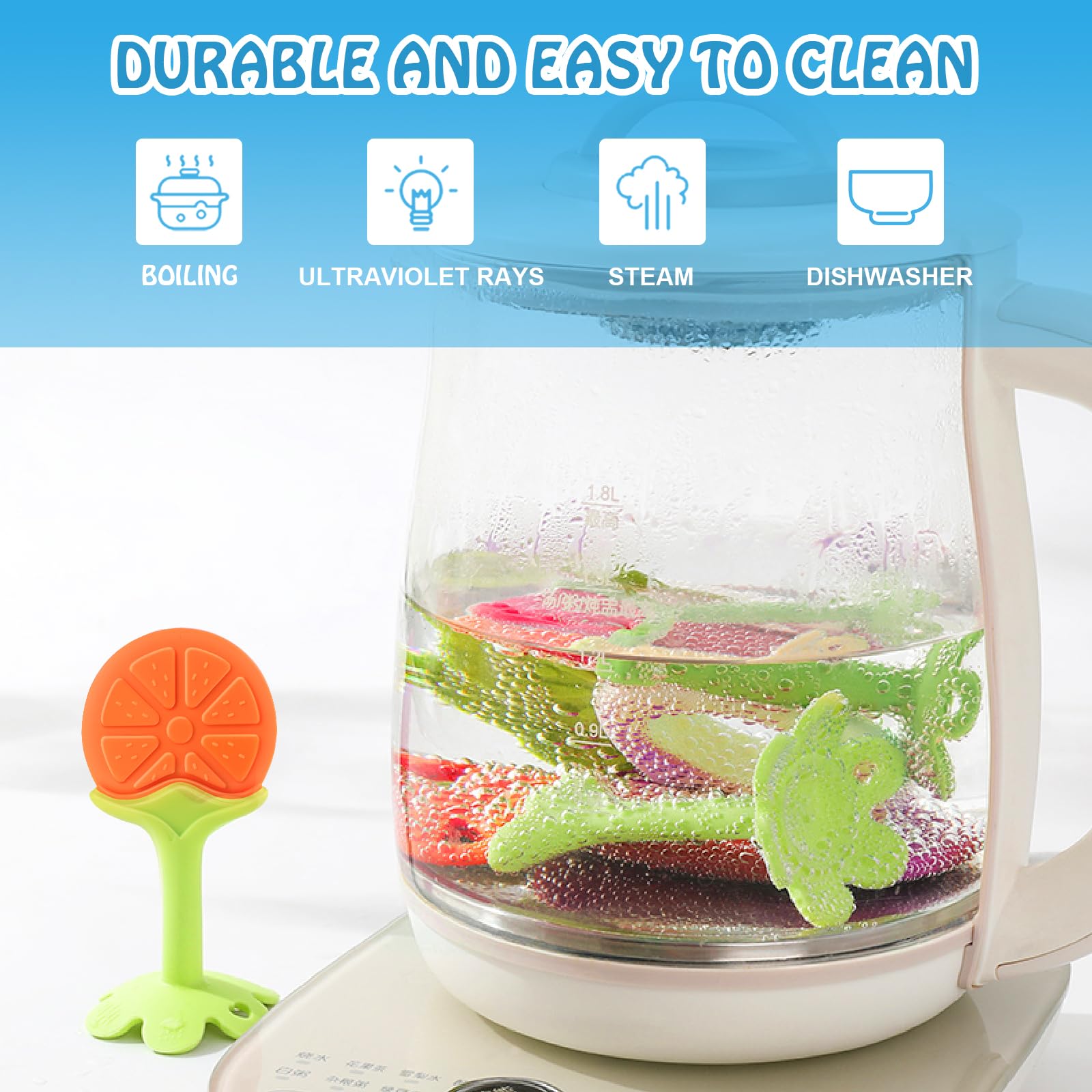 - Multifunction Silicone Baby Teethers - You can teach your baby these fruits while they enjoy looking at the fruit teething toys and grinding their gums on it. Much better option for a baby to look at and easily identify over time to teach them some basic food labeling.
