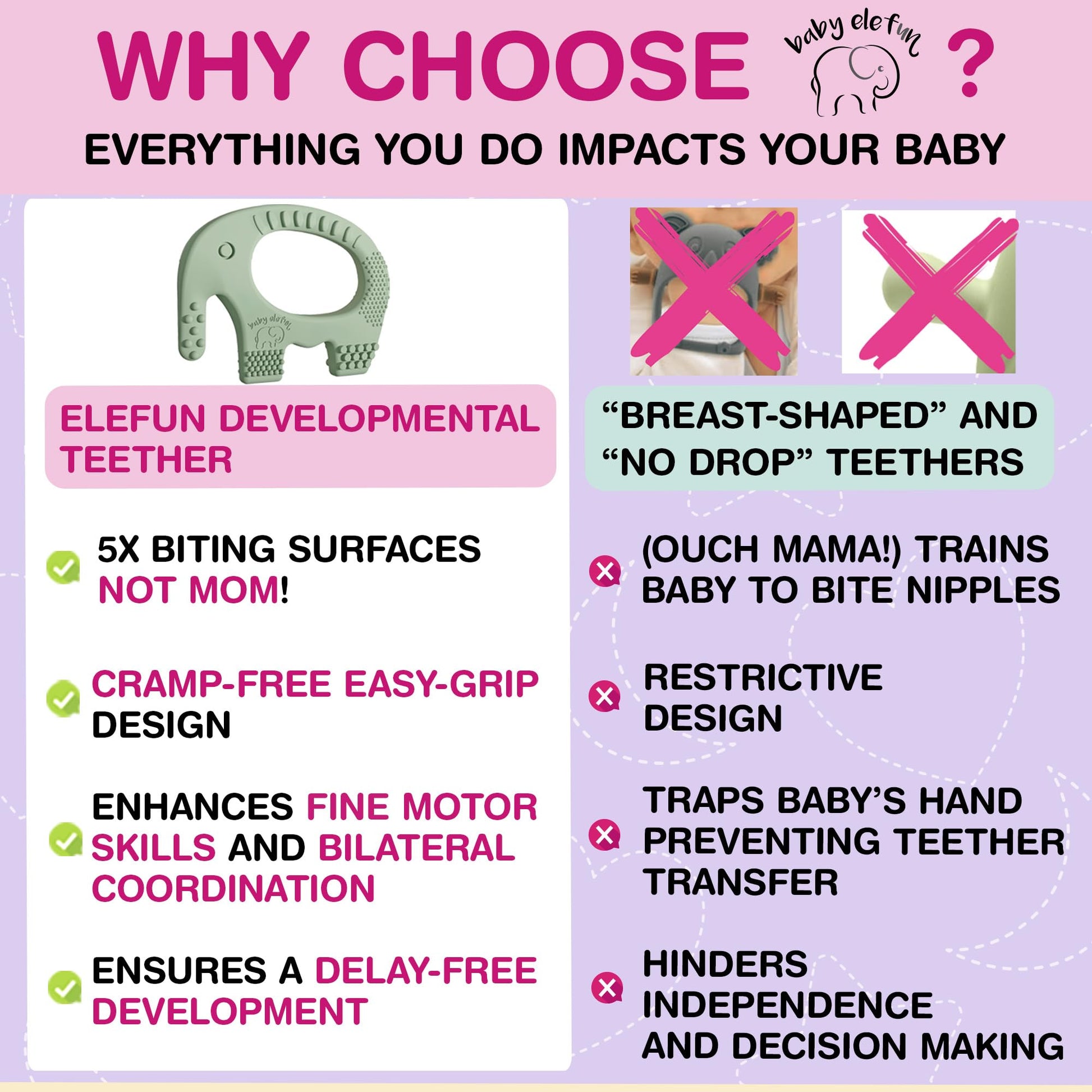 - Save big - replaces 5 baby teethers, mama & thumb: Ask any Pediatric Behavior Analyst and they’ll tell you that muscle memory is a real thing, so if you don’t want baby to bite nipples or fingers or suck their thumb raw, don’t give them something that ‘mimicks it’. Elefun Families say this teether soothes just as effectively as those nipple teether toys without baby learning to bite sensitive areas.