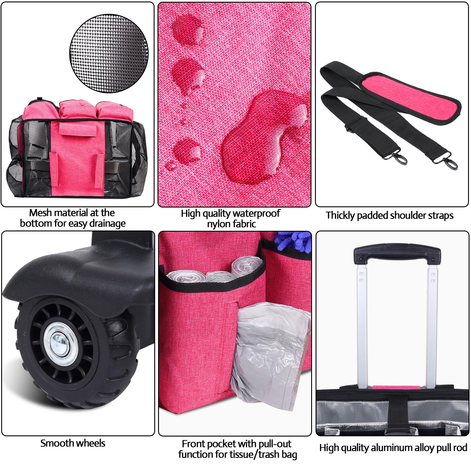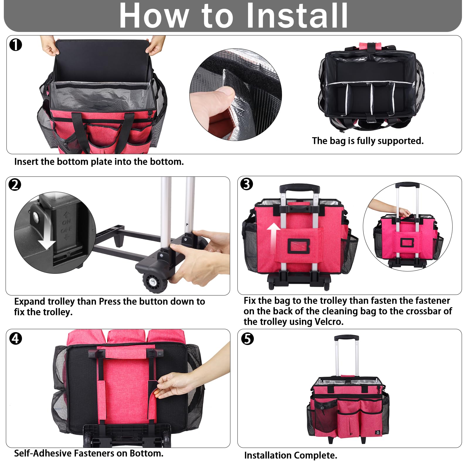 - Detachable and Foldable Trolley: This versatile cleaning caddy with wheels features a detachable, foldable trolley design, equipped with smooth-rolling wheels,allowing for easy storage and transport.This design allows you to transport your cleaning supplies with ease, making it perfect for housekeepers who need to move from room to room or for cleaners who work in multiple locations.The height of the cart handle is 36.2''.