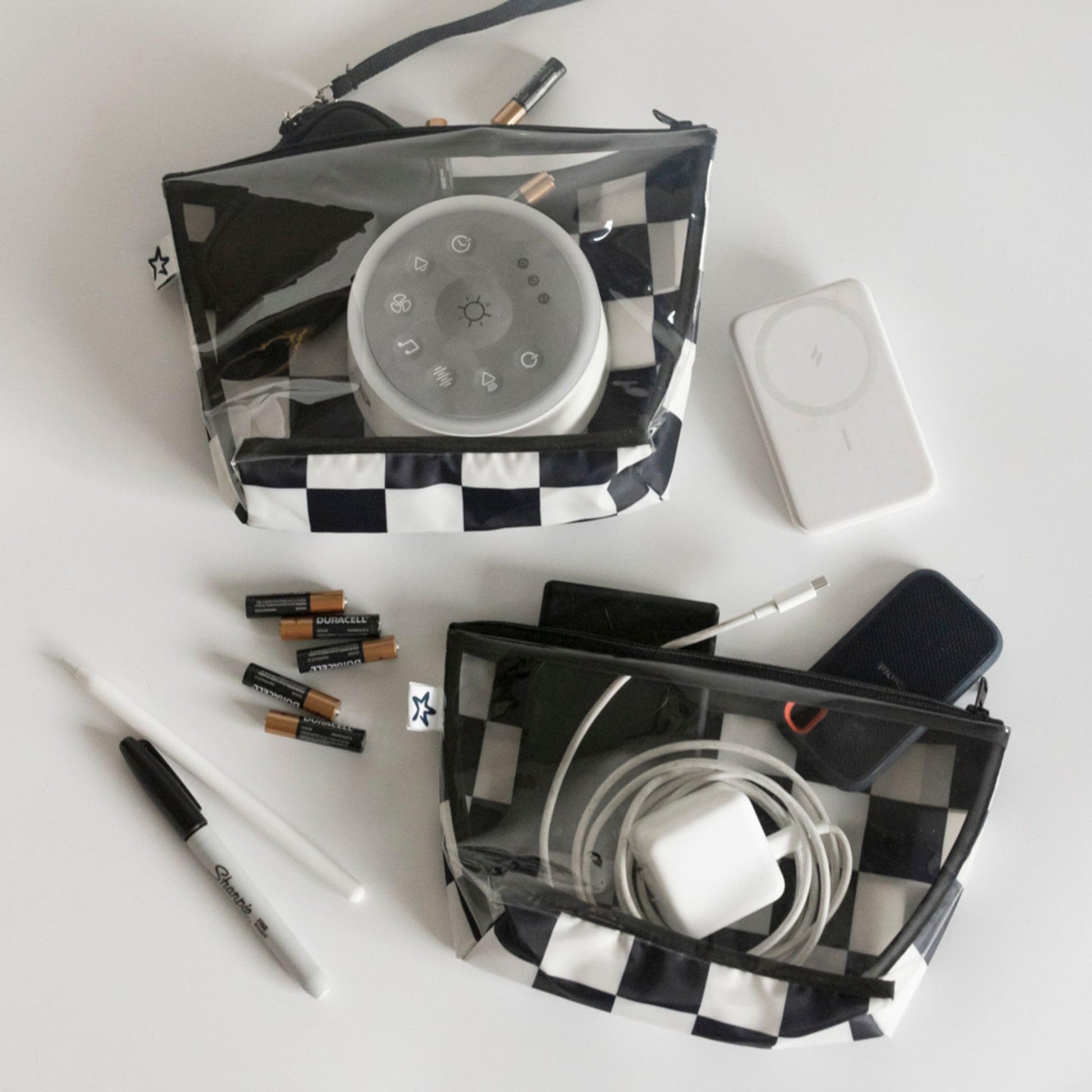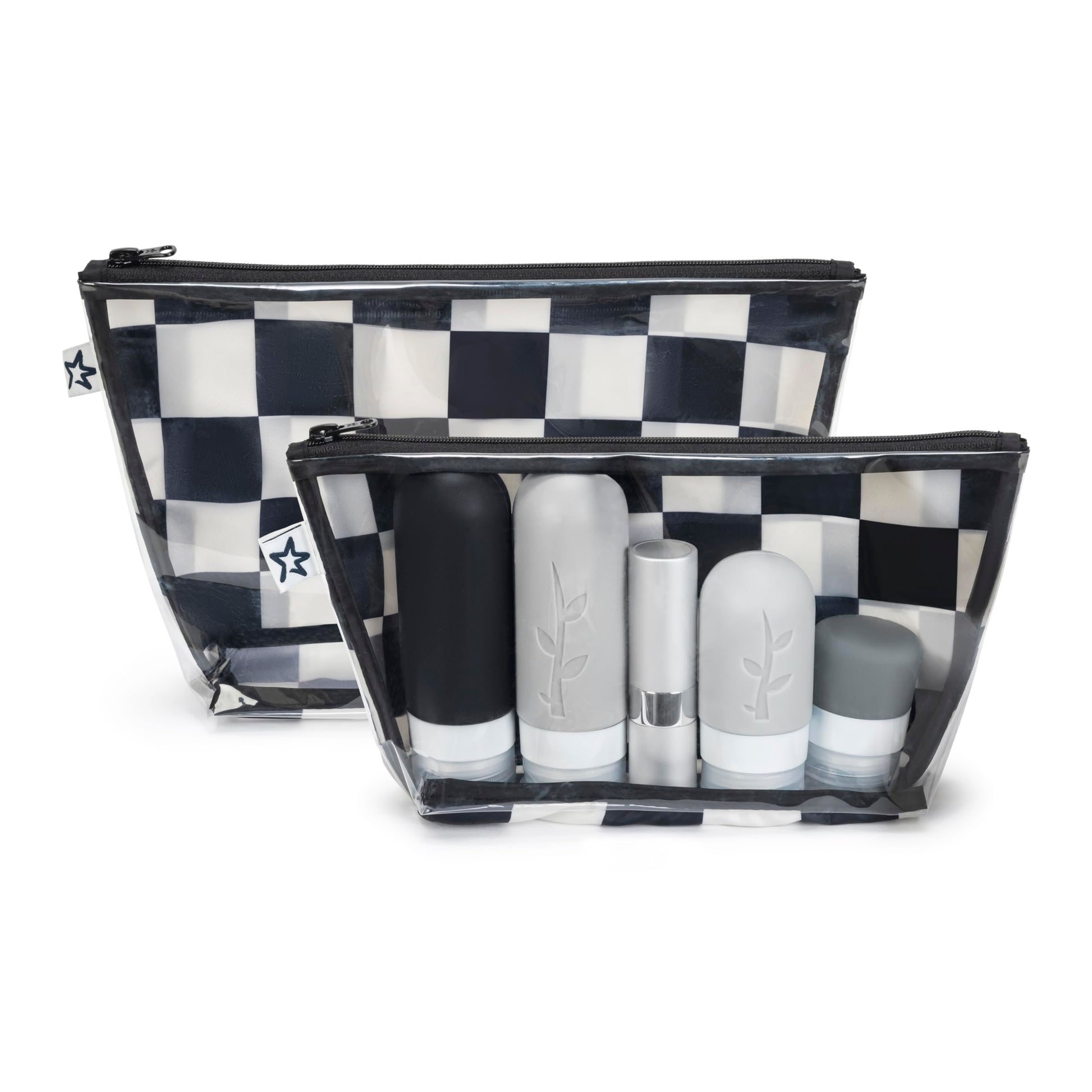 Tiny Twinkle Mess-proof Travel Bags, Airline Compliant, Zipper Closure, Clear Front Pouch, Diaper Bag Packing, Toiletry or Cosmetics Organizer 2 Pack Set (Black Checkers)