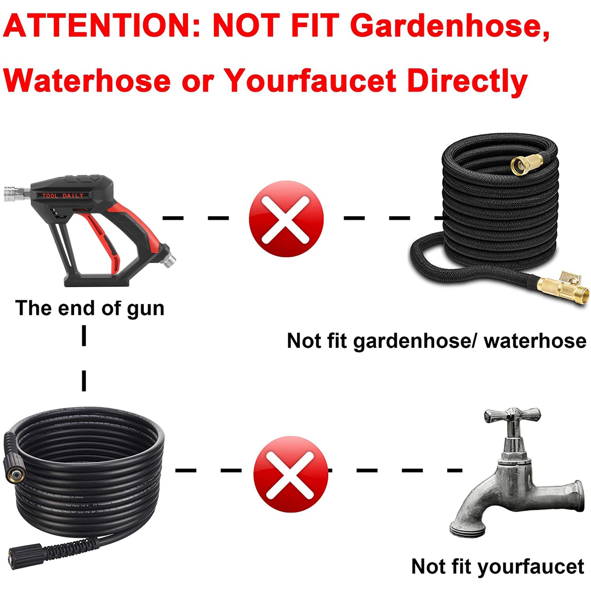 - ATTENTION: Not Fit Garden Hose, Water Hose or Faucet Directly! The pressure washer gun has an M22-14 fitting. If your power washer hose has an M22 14mm fitting, connect the gun to the hose directly. If your hose has an M22 15mm fitting, use the brass coupler to connect the gun and hose