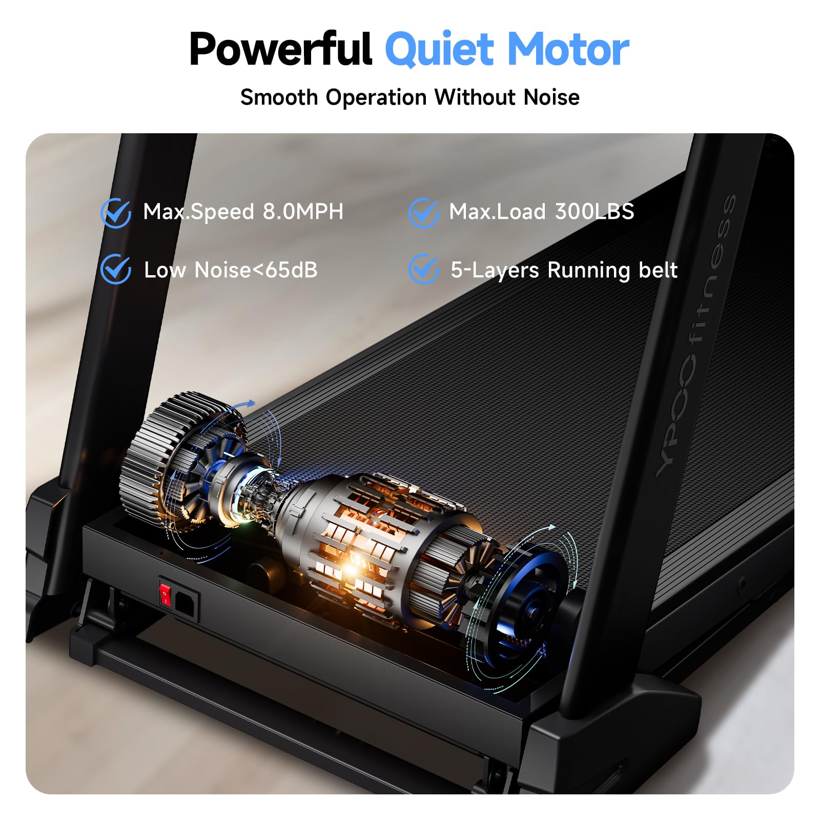 - 【Versatile Speed Options】With quick-access speed controls for 3 mph, 6 mph, and up to 8 mph, YPOO folding treadmill adapts to all fitness levels, whether you're walking, jogging, or running.The spacious 5-layer non-slip belt ensures a safe, comfortable workout. Shortcut buttons and dual cup holders add convenience, making it an ideal treadmill for home use.