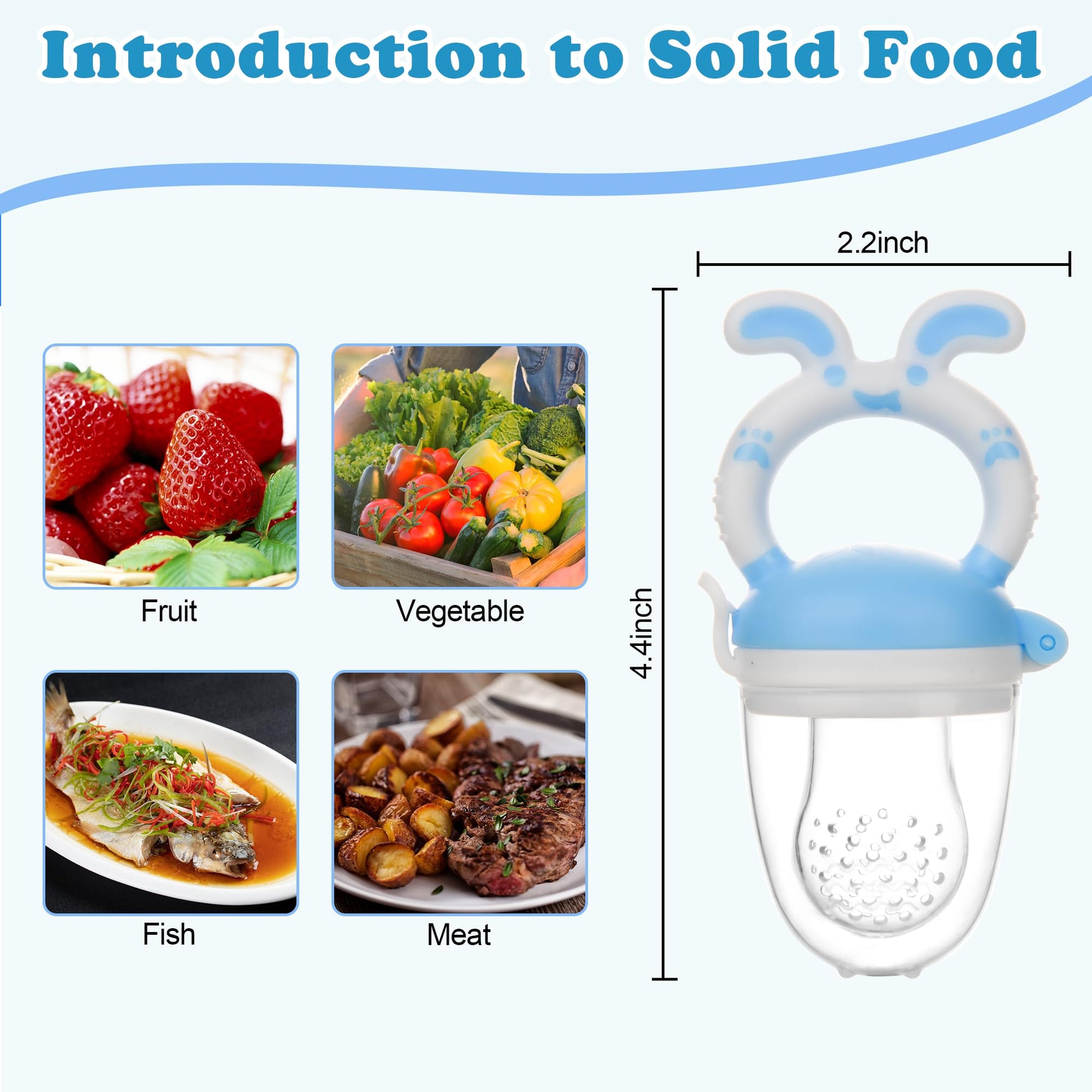 - 【 MULTI-FUNCTIONAL-Safely Introduce Solids】: Baby food feeder pacifier-a perfect way to introduce solid to baby, soft silicone food pouch with 2mm small holes only allow small, digestible pieces to pass through to ensure safe feeding. Just put frozen fruits,vegetables, meat fish or frozen pieces, frozen breastmilk, your baby will enjoy tasting, sucking and chewing on.