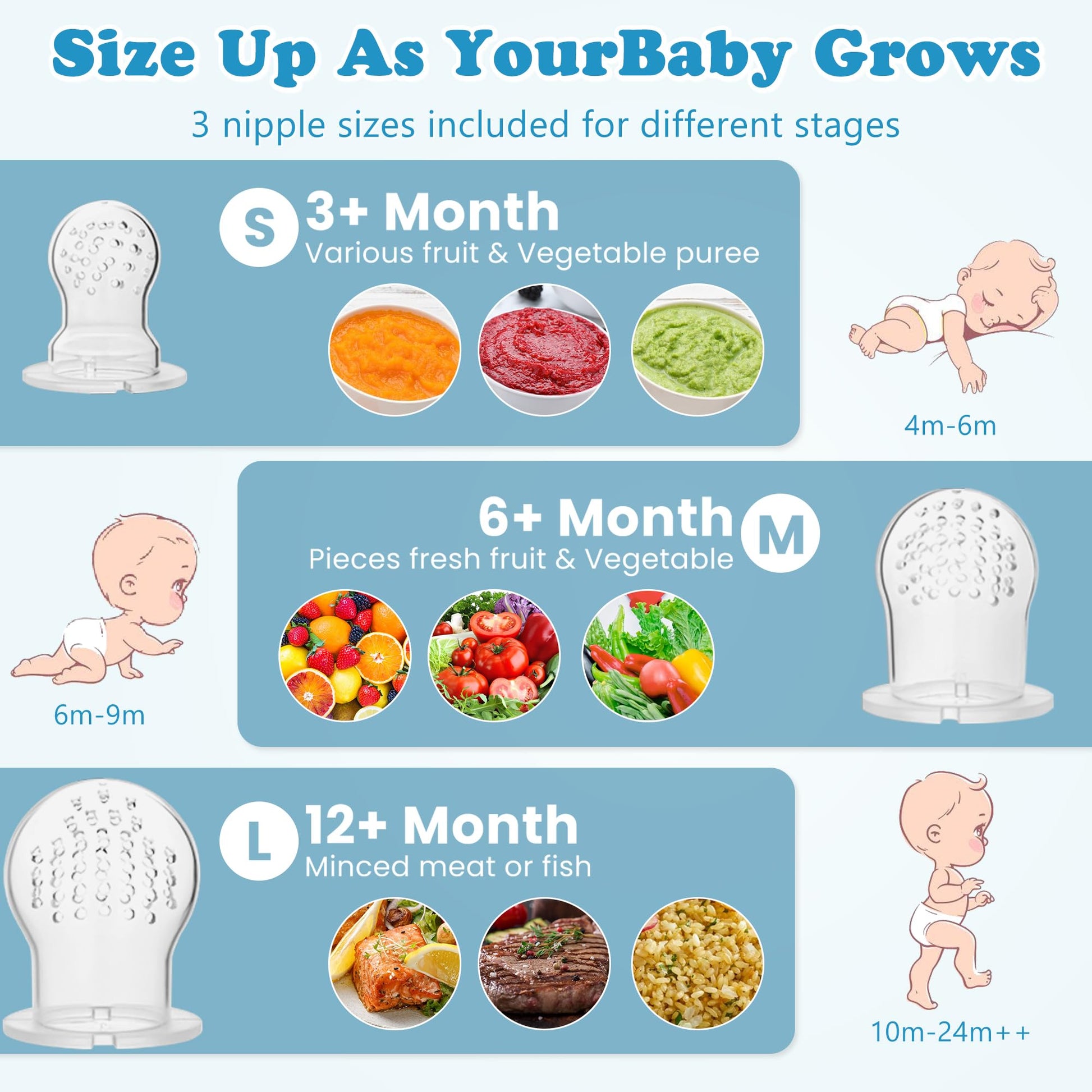 - 【ALL SIZES INCLUDED-Accompany with Your Baby Growth】:small, medium and large three sizes sacs are included in the fruit feeder package to fit different month age baby, S for 4-6 months, M for 6-10 months, L for 10 months+, you can choose the suitable size for your baby at different months.
