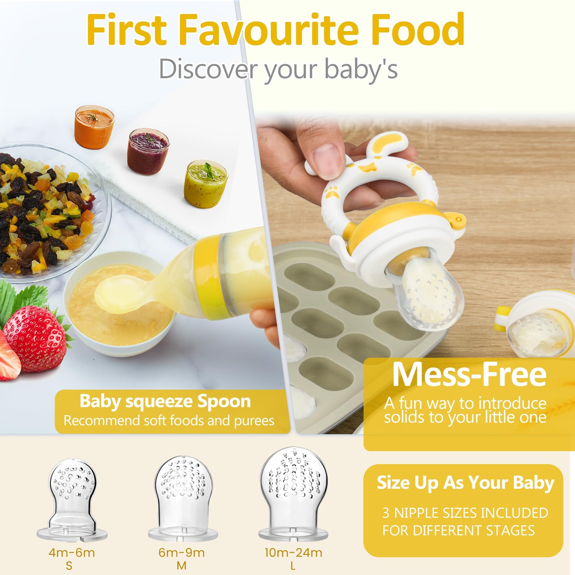 - 【Teething Relief】:while our baby go through weaning and teething phase, Fill baby feeder pacifiers with frozen fruit to provide your baby with safely and naturally soothe sore, swollen gums.Our baby food pacifier feeder can prevent babies from biting or sucking their fingers.Fruit feeder helps protect children's oral hygiene.